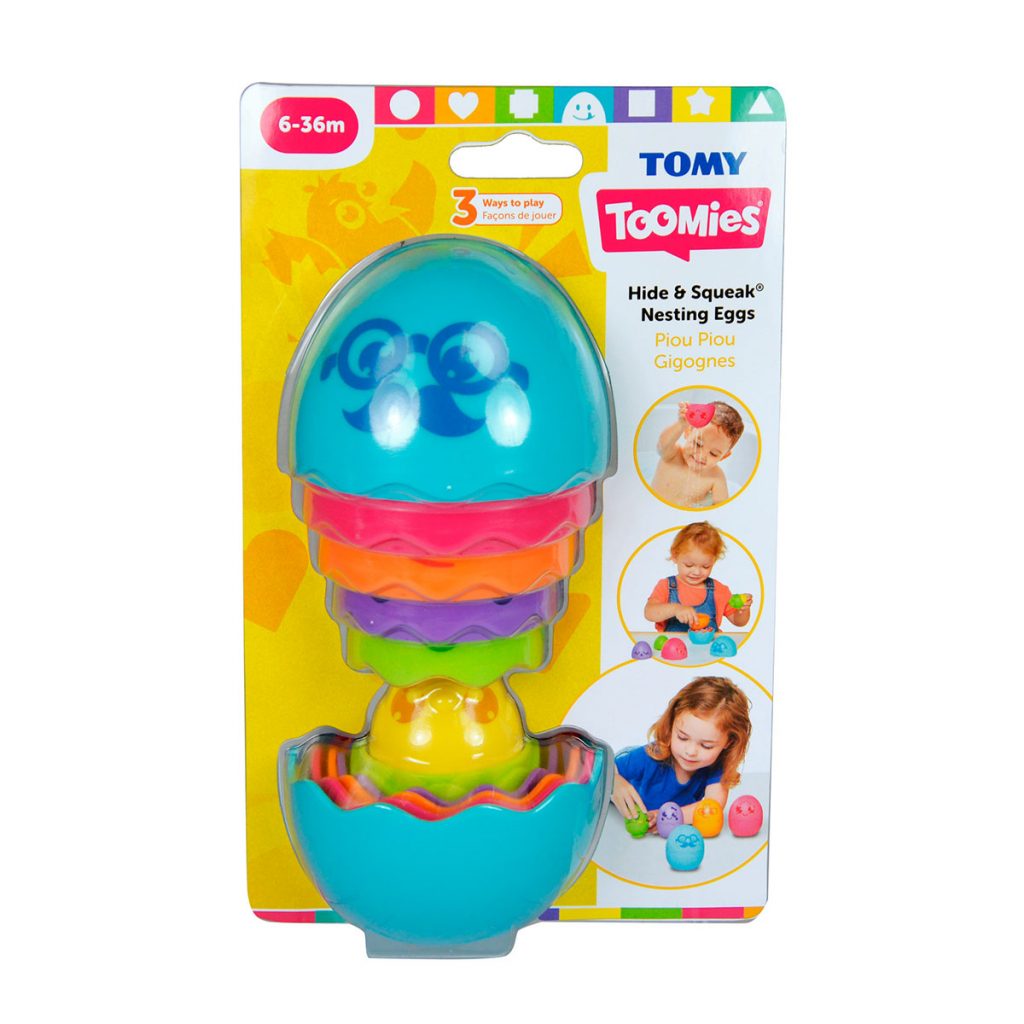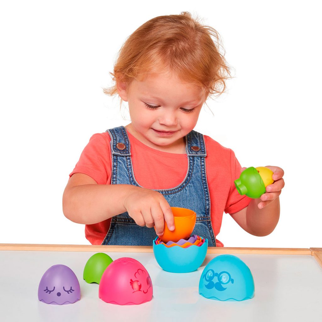 Los niños reconocerán cómo unir las formas, emparejar los colores, descubrir sonidos y colocar cáscaras en los huevos. ¡Además estos huevos pueden servir como rociadores a la hora del baño!