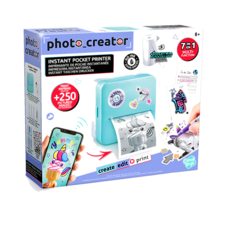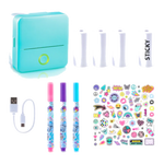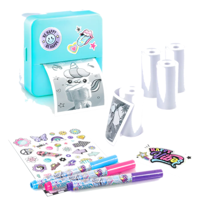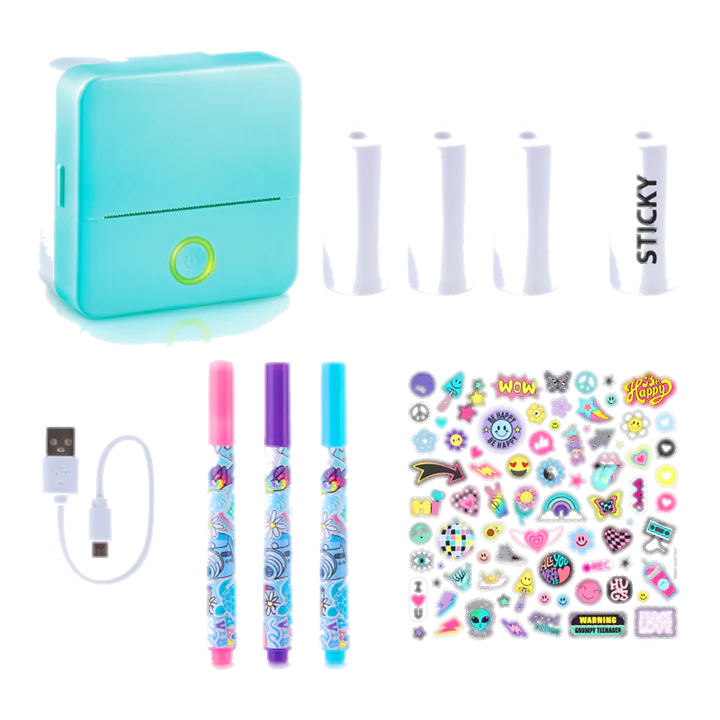 Incluye 4 rollos de papel (1 de ellos adhesivo), rotuladores y pegatinas.