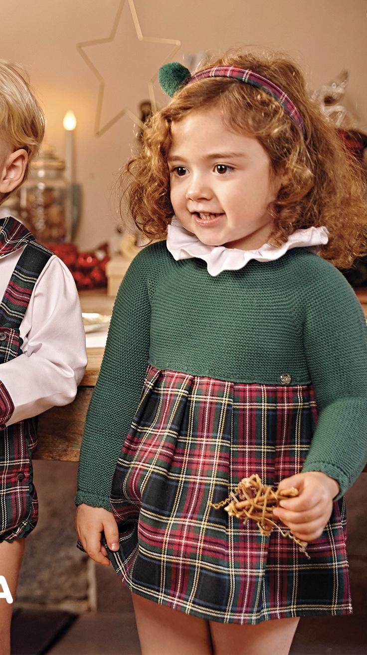 El cuerpo es de punto verde musgo, volante blanco en el cuello. La falda de paño de cuadros escoceses rojo y verde.