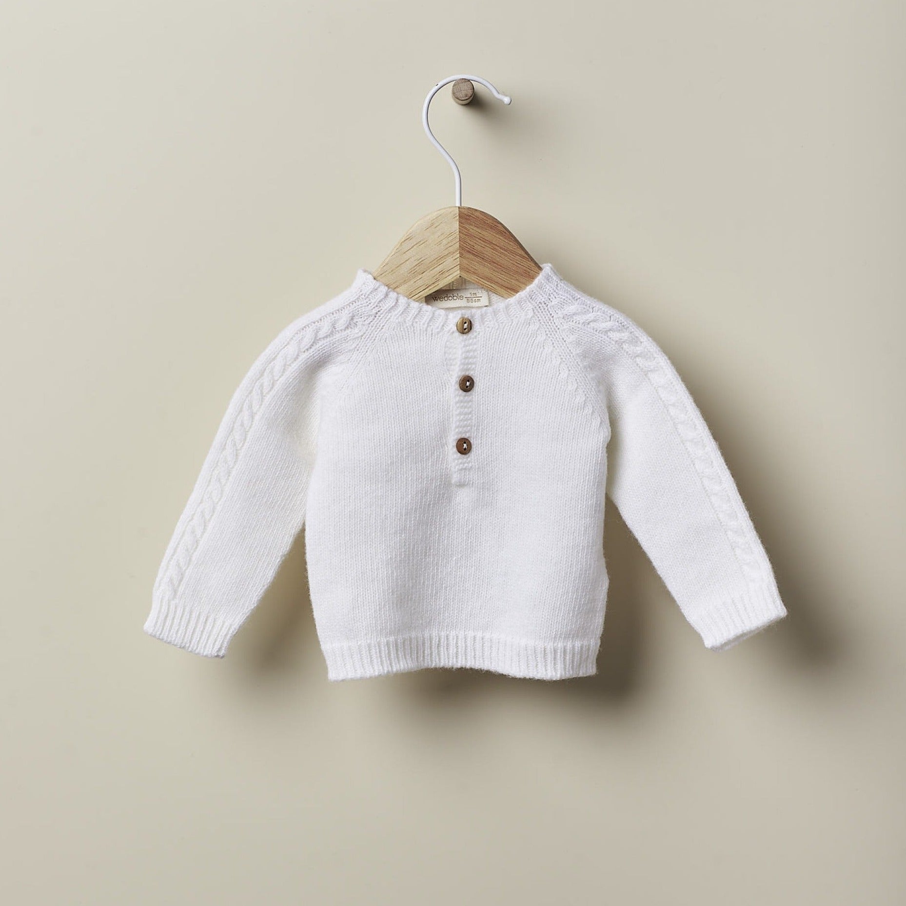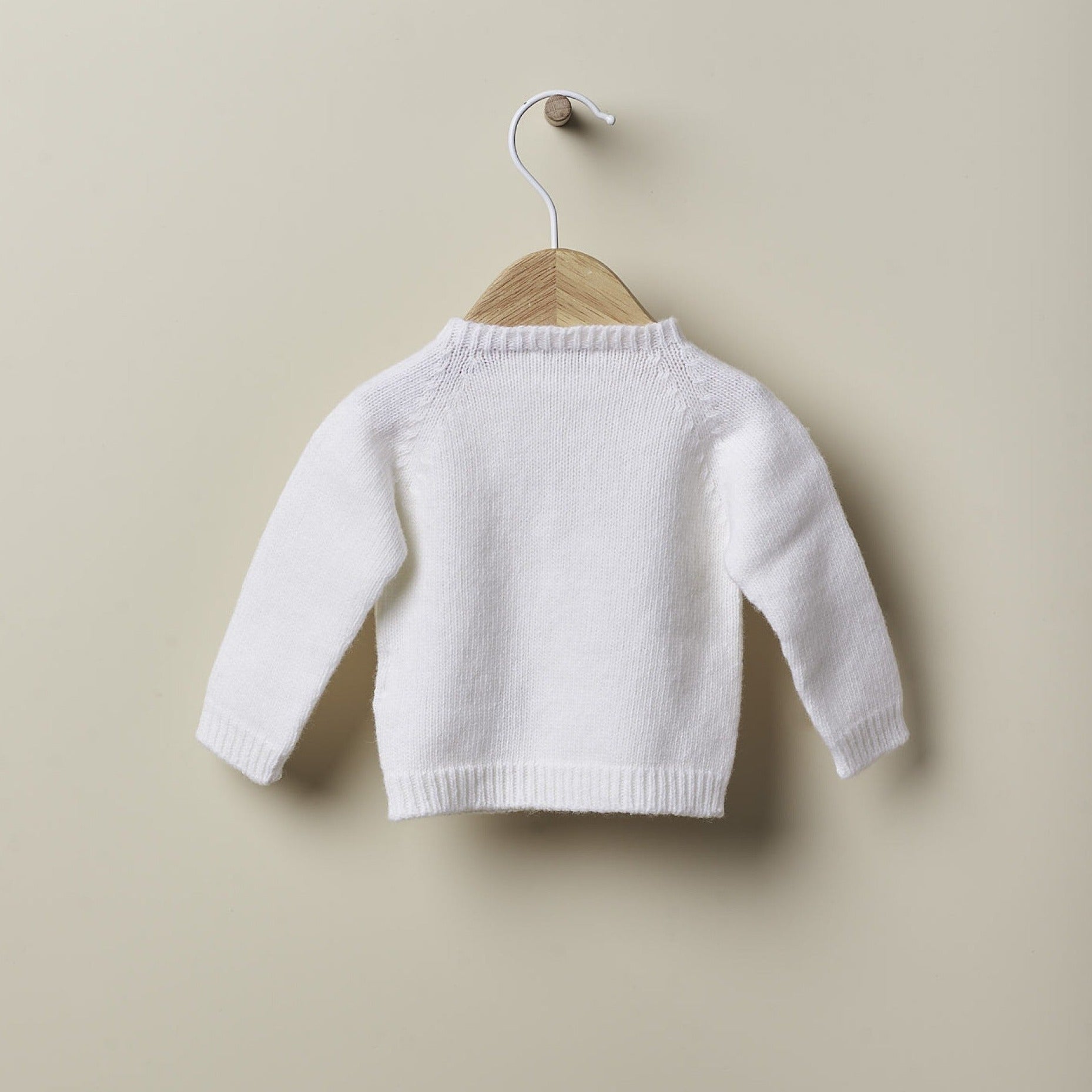 Jersey tejido en suave mezcla de lana merino y cashmere, ideal para bebés niños y niñas de hasta 4 años. Jersey de manga larga, cierre delantero con botones de madera.