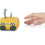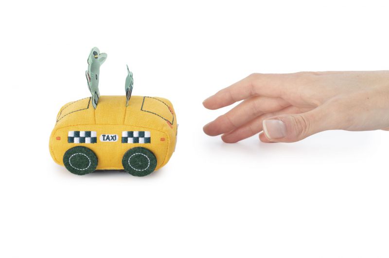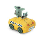 El Sr. Búho tiene que coger un avión. Joe salta a su taxi para llevarlo. Este vehículo flexible es ideal para las manitas del bebé. ¡Un poquito de marcha atrás y ya está! el vehículo parte de nuevo.