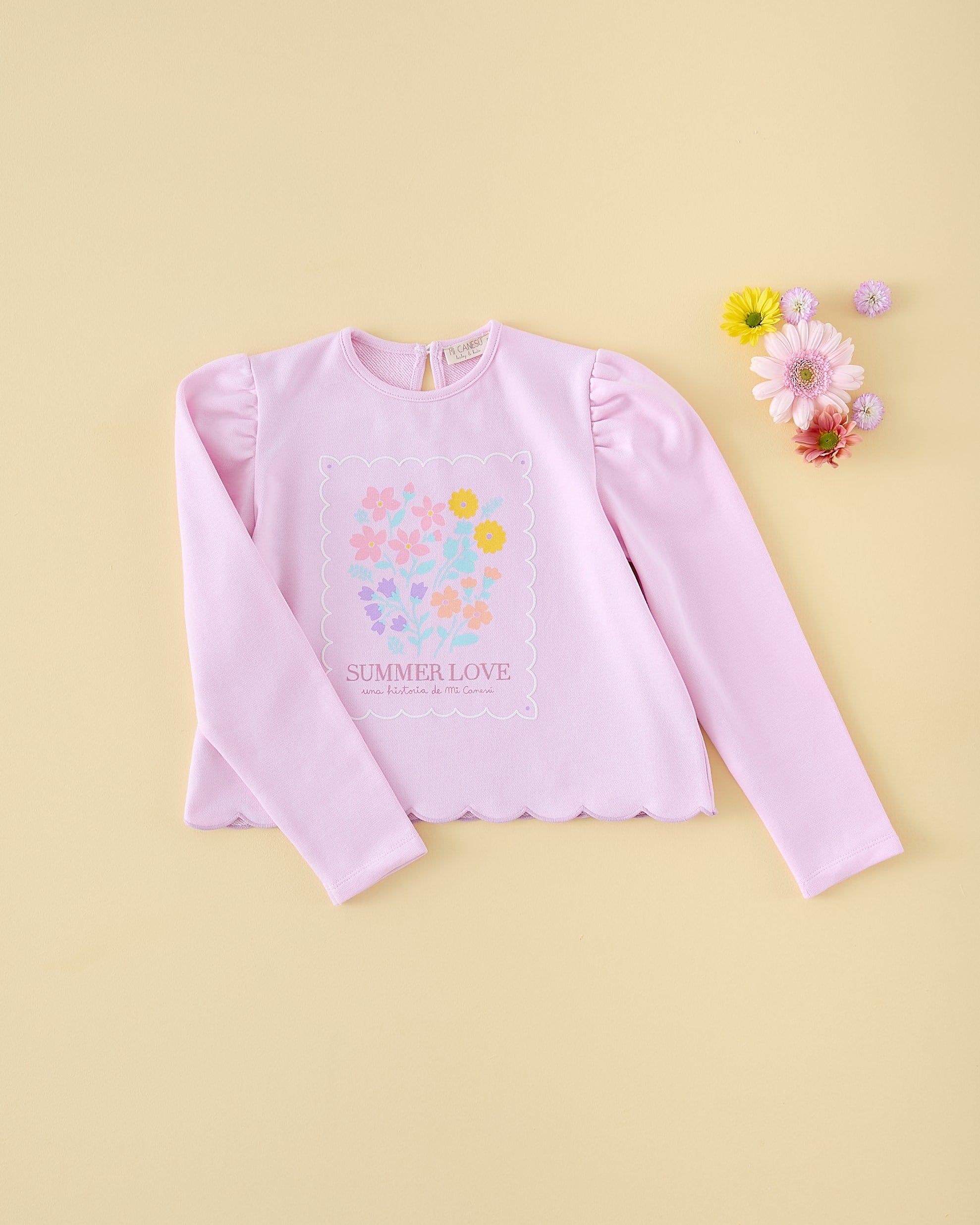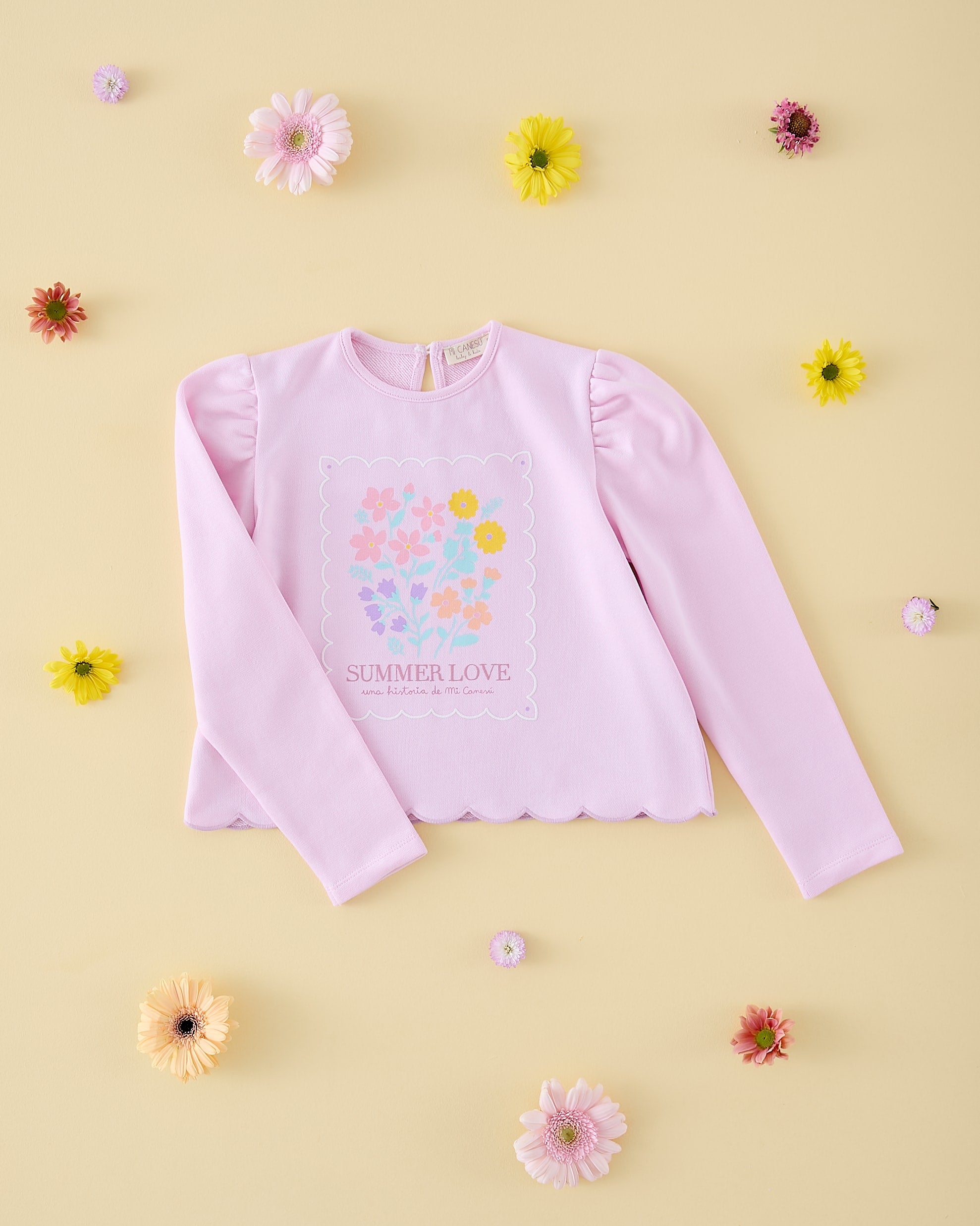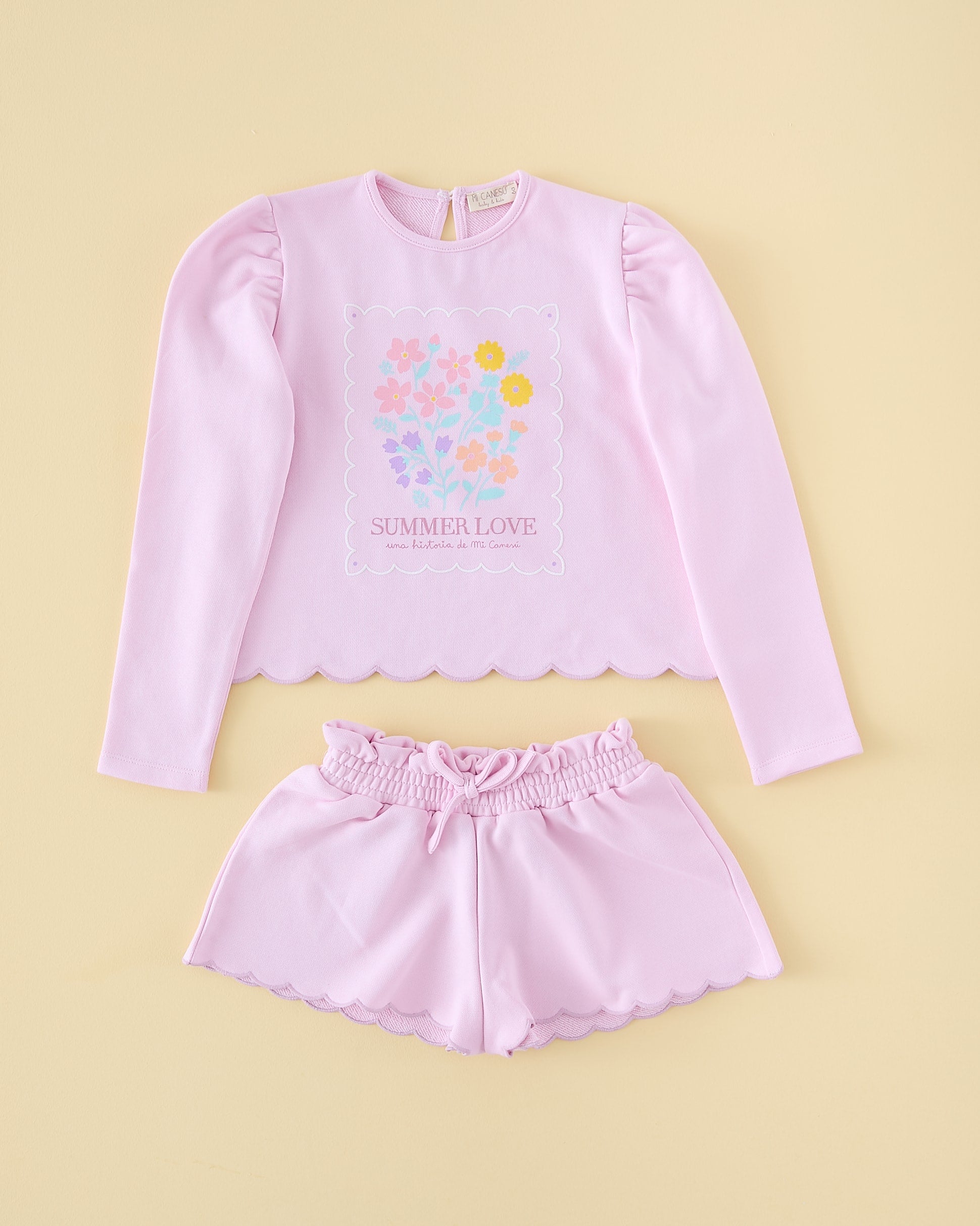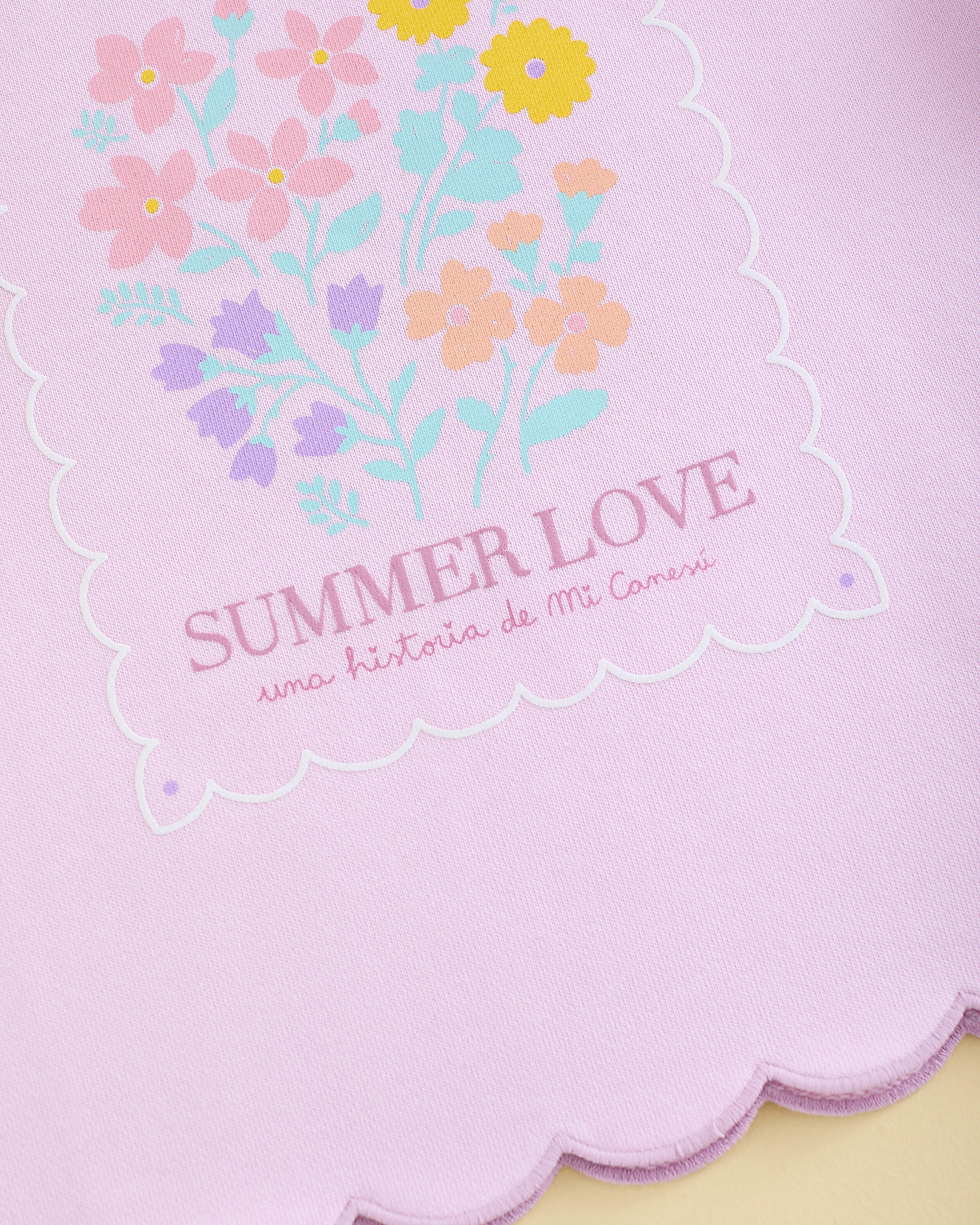 Jogging de niña en color malva con ilustración de flores “Sumer Love”. Una de nuestras prendas estrella de la colección. Nos encanta el dibujo de su sello con ramilletes de flores a juego con los tonos del Liberty Sweet Malva. Coordinado con nuestro short jogging malva o el pantalón cropped jogging blanco crearás un look muy cómodo y estiloso.