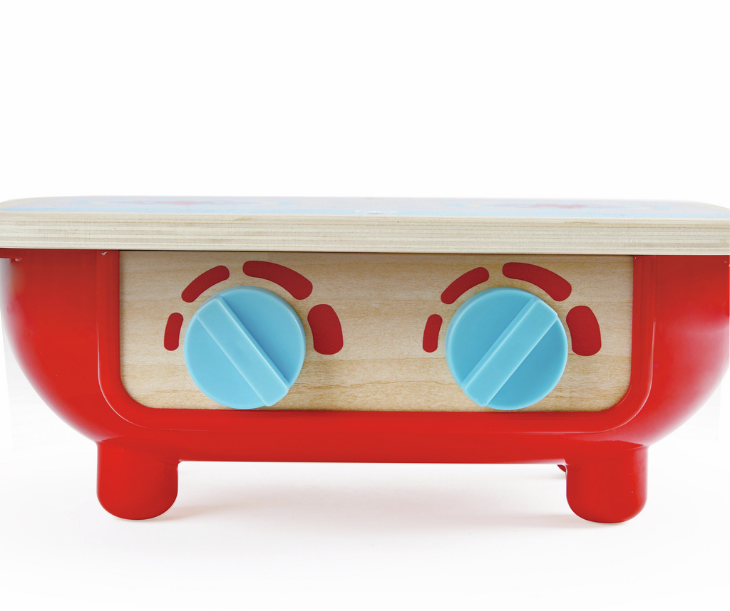 ¡Prepara deliciosas comidas para tu familia y amigos! Esta divertida cocina de madera incluye una olla con tapa, una sartén, una cuchara y una espátula para que cocines. Los mandos emiten un suave clic cuando se giran. Cuando termines, guarda la olla y la sartén en los espacios situados detrás de la encimera.