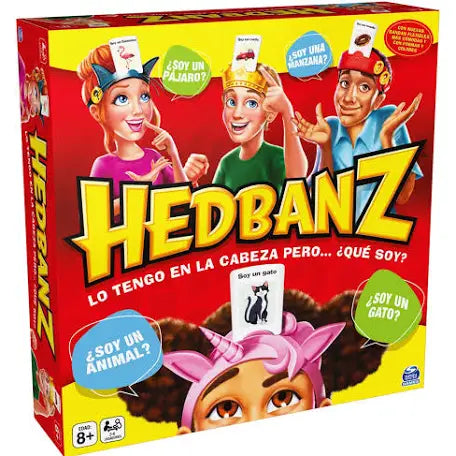 El juego "¿Qué tengo en la cabeza?" de Hedbanz Family de Spin Master es un juego educativo que fomenta la habilidad manual, la inteligencia y la sociabilidad. Los jugadores deben adivinar la imagen en la tarjeta que se coloca en una banda para la cabeza. Cada jugador elige su banda y toma una tarjeta sin mirarla, colocándola de forma que los demás puedan verla. A través de preguntas que solo pueden ser respondidas con "sí" o "no", los participantes intentan descubrir la imagen correspondiente. El objetivo es ser el primero en acumular tres fichas de puntuación.