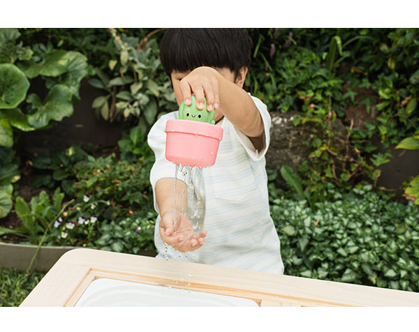 Al sacarlo de la bañera, el agua se escurre encantadoramente por los orificios de drenaje mientras el cactus vuelve a esconderse.