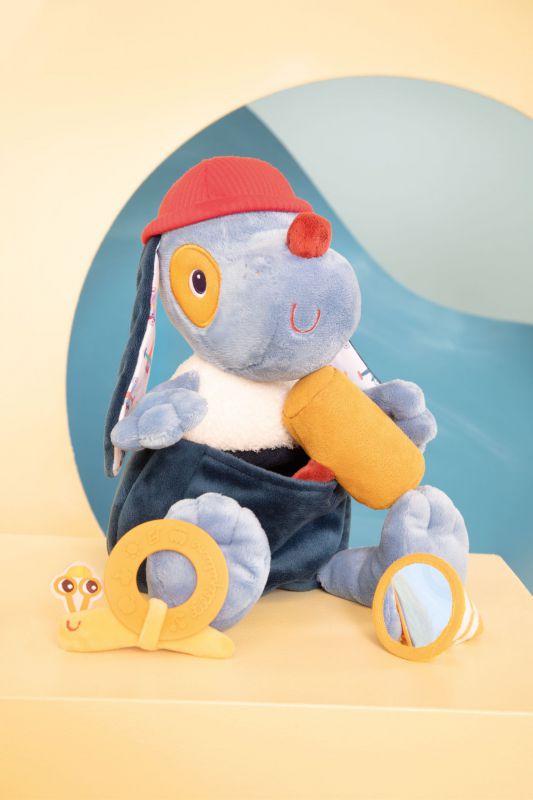 Jules el manitas esconde varios objetos en su gran bolsillo ventral. Un cono con espejo, un anillo de dentición de silicona en el lomo de un caracol y un martillo con sonido de papel: toma los objetos, descubre las actividades y los diferentes sonidos. Este manitas estimula la motricidad fina, la audición y desafía la imaginación.