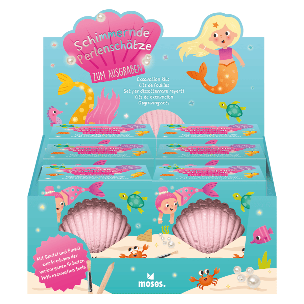 La bonita concha de yeso contiene 1 cuenta grande y 27 pequeñas ocultas, que se pueden enhebrar para formar una brillante pulsera una vez desenterradas.