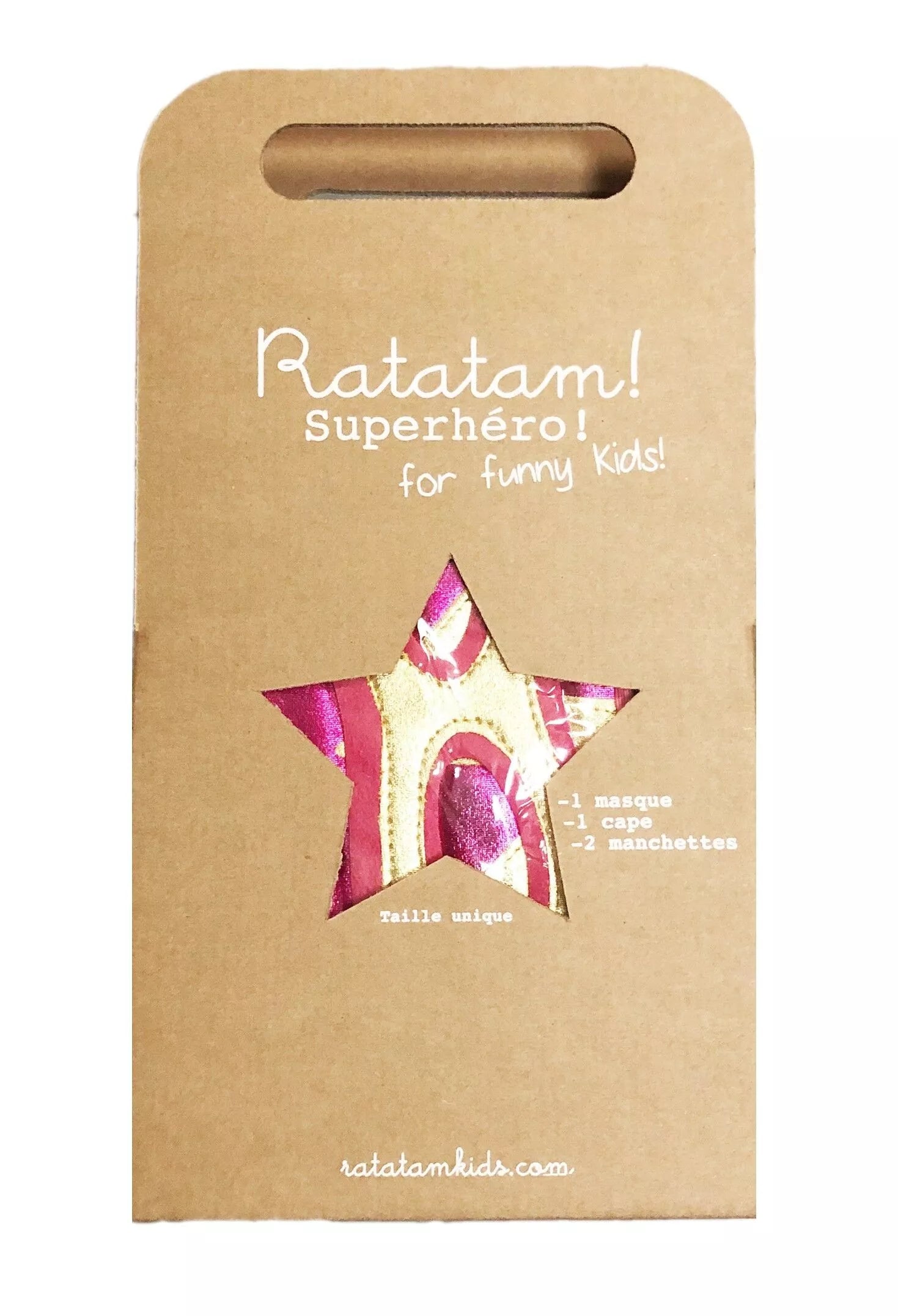 Este kit de Superheroína se compone de una capa rosa con un rayo dorado, 2 puños con un rayo dorado y una máscara.