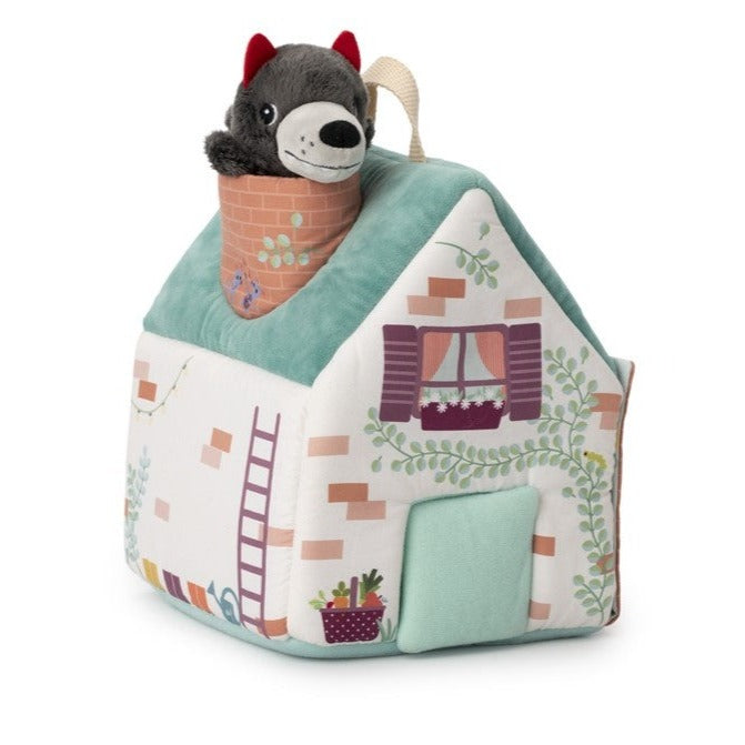 Este juguete de tela, inspirado en el cuento del lobo y los tres cerditos, incluye 4 personajes, 2 casitas que representan las casas de paja y madera, y una tercera casa que representa la casa de ladrillos. La casa de ladrillos tiene una chimenea por donde el lobo puede deslizarse, así como una pared que se abre. Estimulando la imaginación, este juguete fomenta el juego creativo y desarrolla habilidades motoras finas.