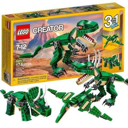 ¡Diviértete con el asombroso T-Rex! Cuenta con una terrorífica combinación de colores en verde oscuro y beige, ojos de color naranja brillante, uniones y cabeza articuladas, grandes garras y boca que se abre con dientes puntiagudos. Incluye también la última presa del dinosaurio (una caja torácica para construir). Convierte este modelo del set LEGO® Creator “3 en 1” Grandes dinosaurios en un triceratops o un pterodáctilo.