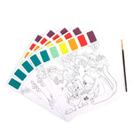 Este cuaderno de pintar incorpora una paleta de colores en cada una de sus hojas y un pincel. Solo hay que aplicar un poco de agua y pintar las ilustraciones como más te guste.