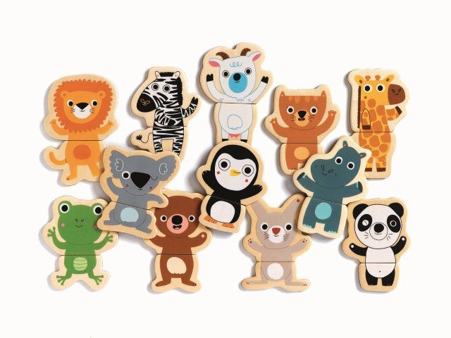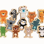 Caja de 24 piezas magnéticas de madera para formar animales o imaginar otros divertidos. ¡El niño ayuda a la jirafa a encontrar sus patas y al león a encontrar su cabeza!