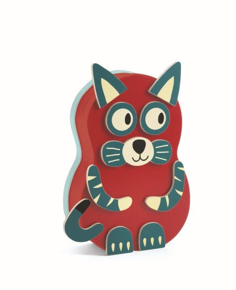 Contenido: 1 caja de metal con forma de animal y 41 piezas de madera magnéticas.