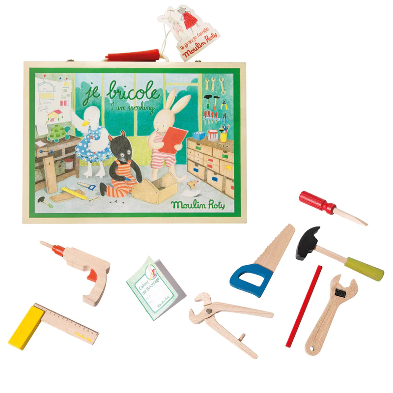Este encantador set DYI con 1 lápiz y 7 herramientas coloridas y redondeadas, fáciles de agarrar para las manos pequeñas. Todo ello cuidadosamente sujeto con velcro y pestillos en un magnífico estuche de madera ilustrado, listo para llevar a cualquier parte.