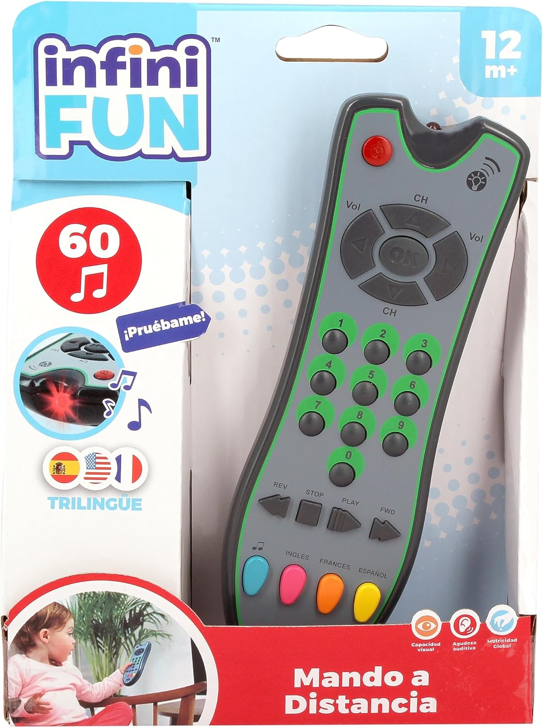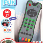 ¡Por fin los pequeños tienen su propio mando a distancia! Es un mando con 24 teclas que simulan un mando de verdad: los más pequeños podrán cambiar de canal, ajustar el volumen, avanzar rápido, etc. Además, podrán escuchar y reconocer los números del 0 al 9. El mando cuenta con 4 modos de juego para activar más de 60 sonidos. La luz roja parpadea con cada pulsación.
