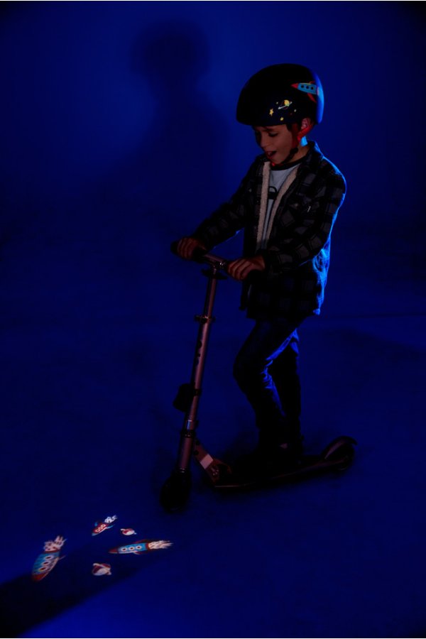 Descubre el Proyector de luz con un diseño de cohetes que puedes llevar contigo de manera versátil. Ya sea sujetándolo al patinete o llevándolo en la mano, la Luz-Proyector de Micro es un accesorio de luego que hará que tus paseos sean mas divertidos. Con la posibilidad de acoplarla al patinete, podrás disfrutar de imágenes y luces entretenidas mientras patinas. Además, estas luces también pueden funcionar como linterna durante tus juegos. ¡La diversión para los niños esta asegurada!