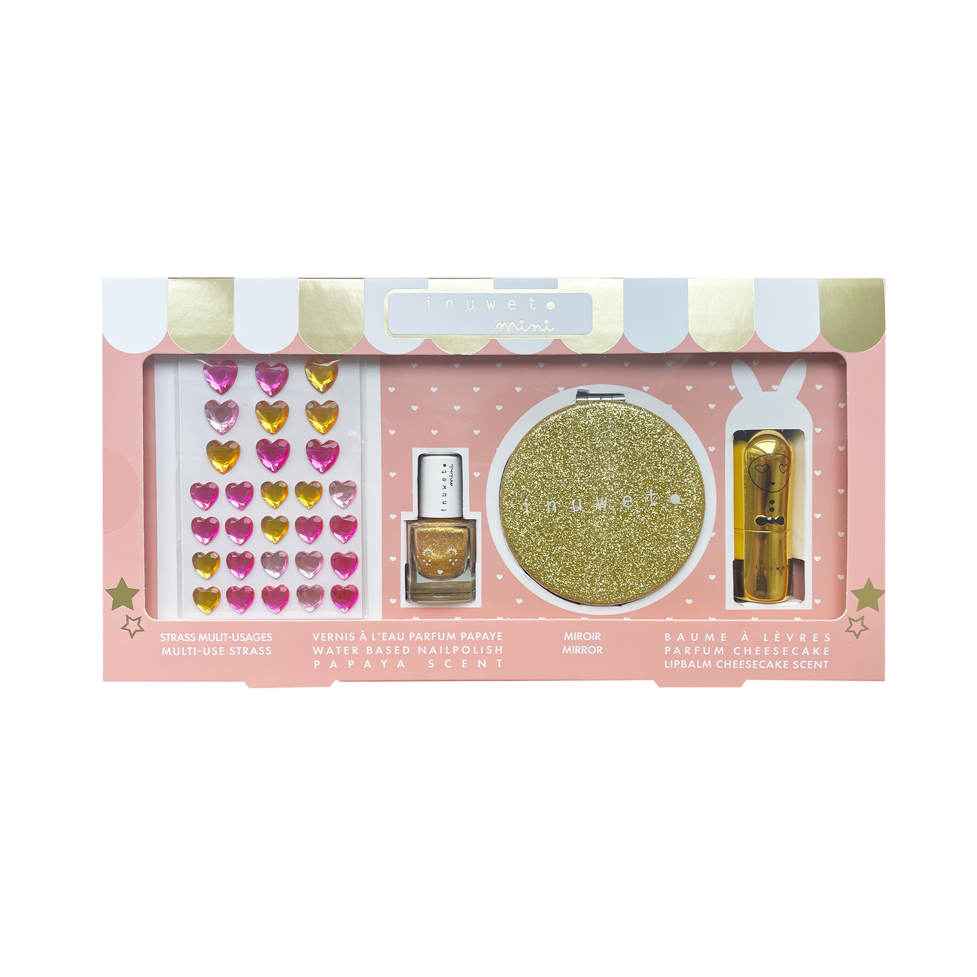Contiene pedrería facial y corporal para pegr, esmalte de uñas, bálsamo labial vegano y espejito.
