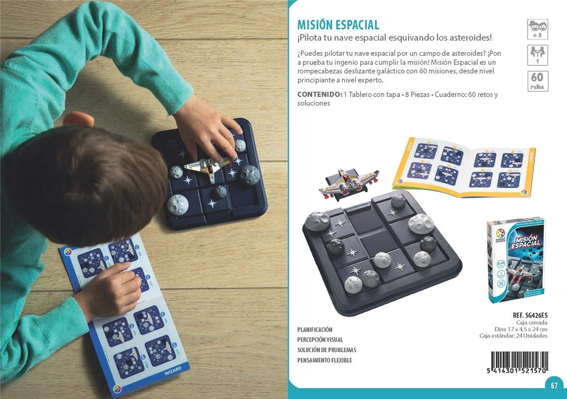 Contenido: 1 tablero con tapa, 8 piezas, libro con 60 desafíos y soluciones.