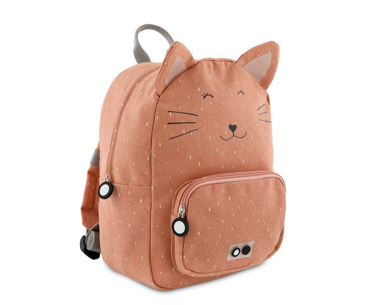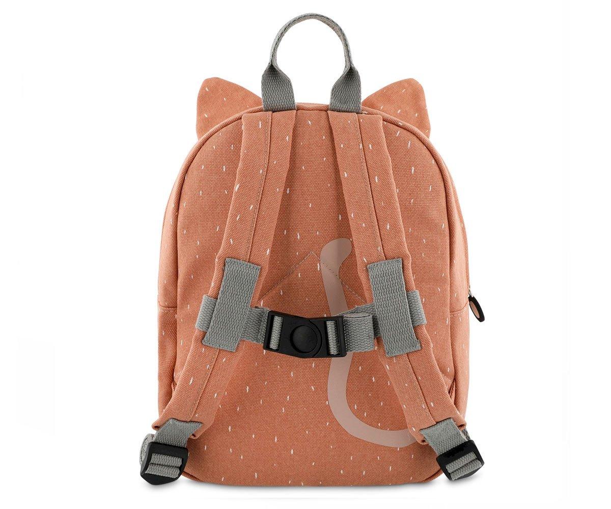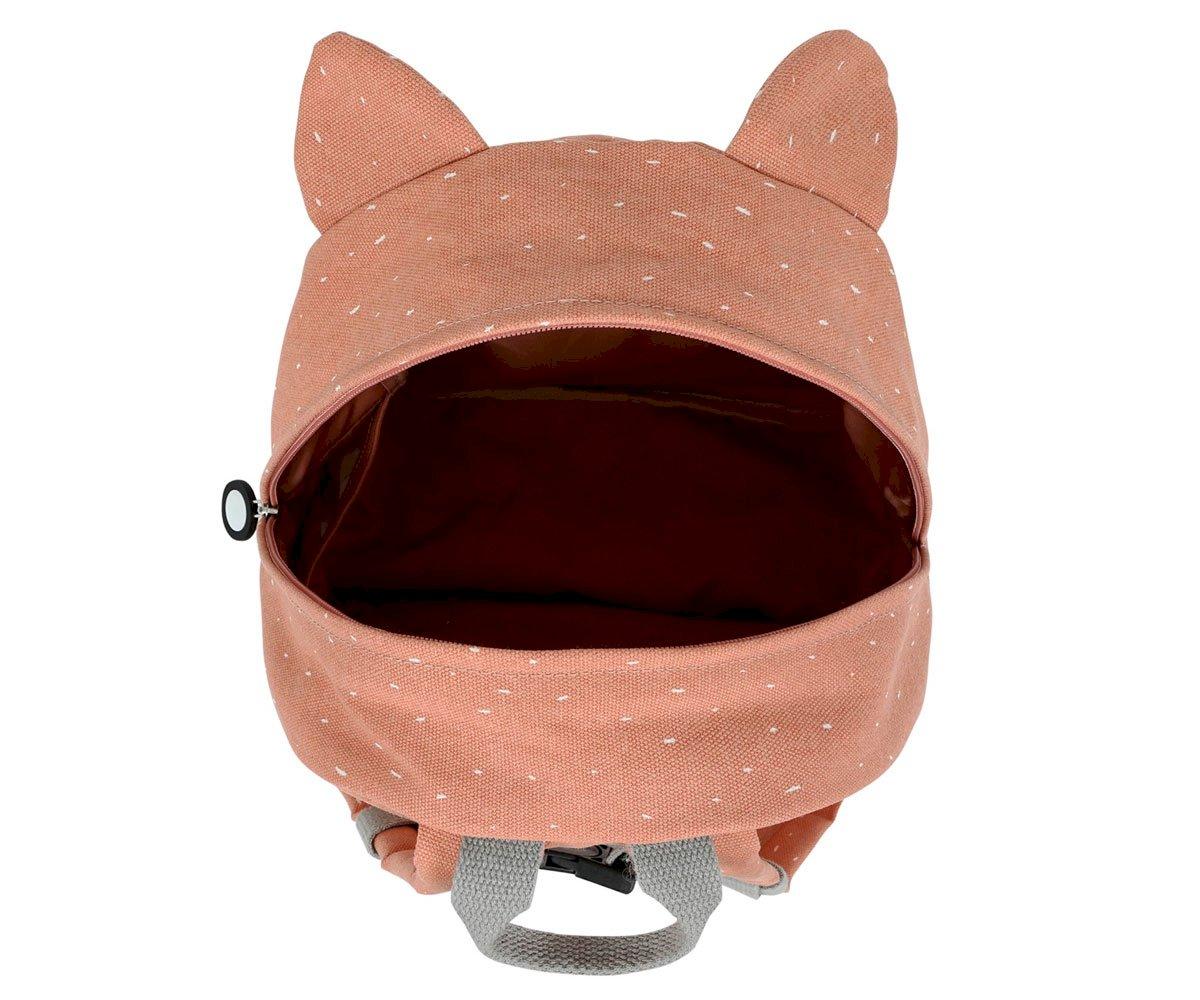 Esta mochila tiene un bolsillo delantero, y sus asas son acolchadas y ajustables. Tiene cierre con clip en el pecho para que al niño no se le caigan las asas. Tiene un bolsillo interior, y una etiqueta de tela para escribir el nombre del niño. Es perfecta para niños de 2 a 5 años. Las mochilas Trixie Baby están fabricadas de algodón 100% con un revestimiento acrílico repelente al agua.