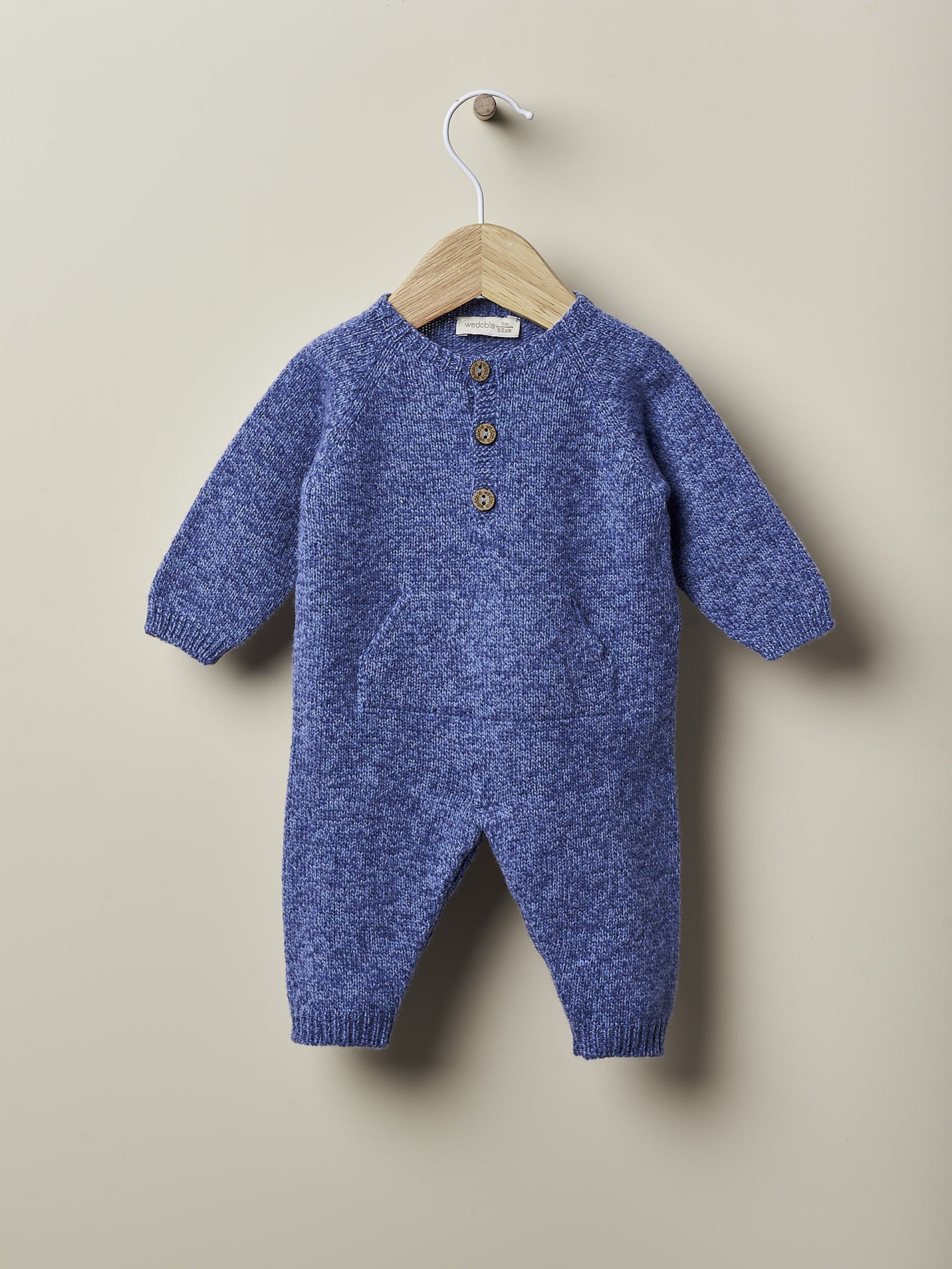 Mono tejido en suave mezcla de lana merino y cashmere, ideal para bebés niños y niñas de hasta 4 años. El mono BABY INFLUENCER de manga larga tiene un útil bolsillo canguro delantero y se abrocha con botones de coco en la parte delantera y con automáticos entre las piernas.