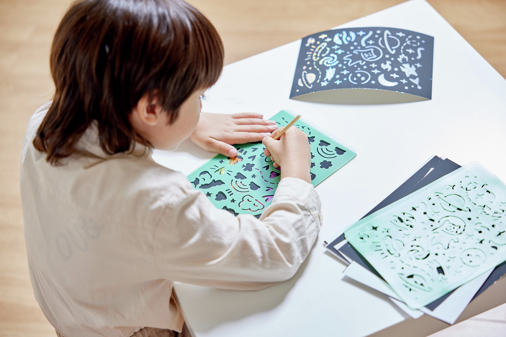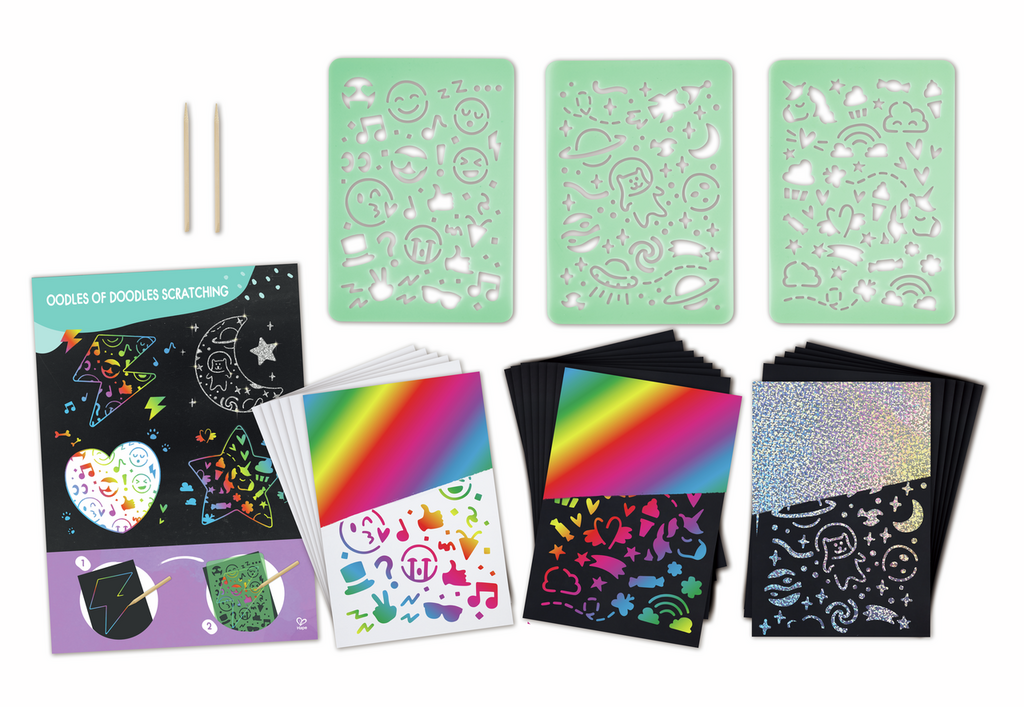 Lleva los garabatos a un nivel completamente nuevo con este increíble juego de rayado. Coloca las plantillas sobre las hojas incluidas y rasca con un lápiz de madera para descubrir las diferentes capas de color que hay debajo. Incluye un póster con consejos y sugerencias. Perfecto para usar en el caballete de sobremesa Hape.