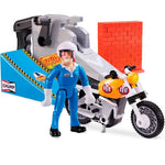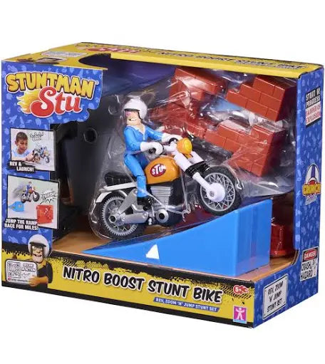 ¡Lánzate a toda velocidad con la moto acrobática de Stuntman Stu! Usa la rampa incluida para despegar y recrear las acrobacias más salvajes. ¡Pisa a fondo y vuela!