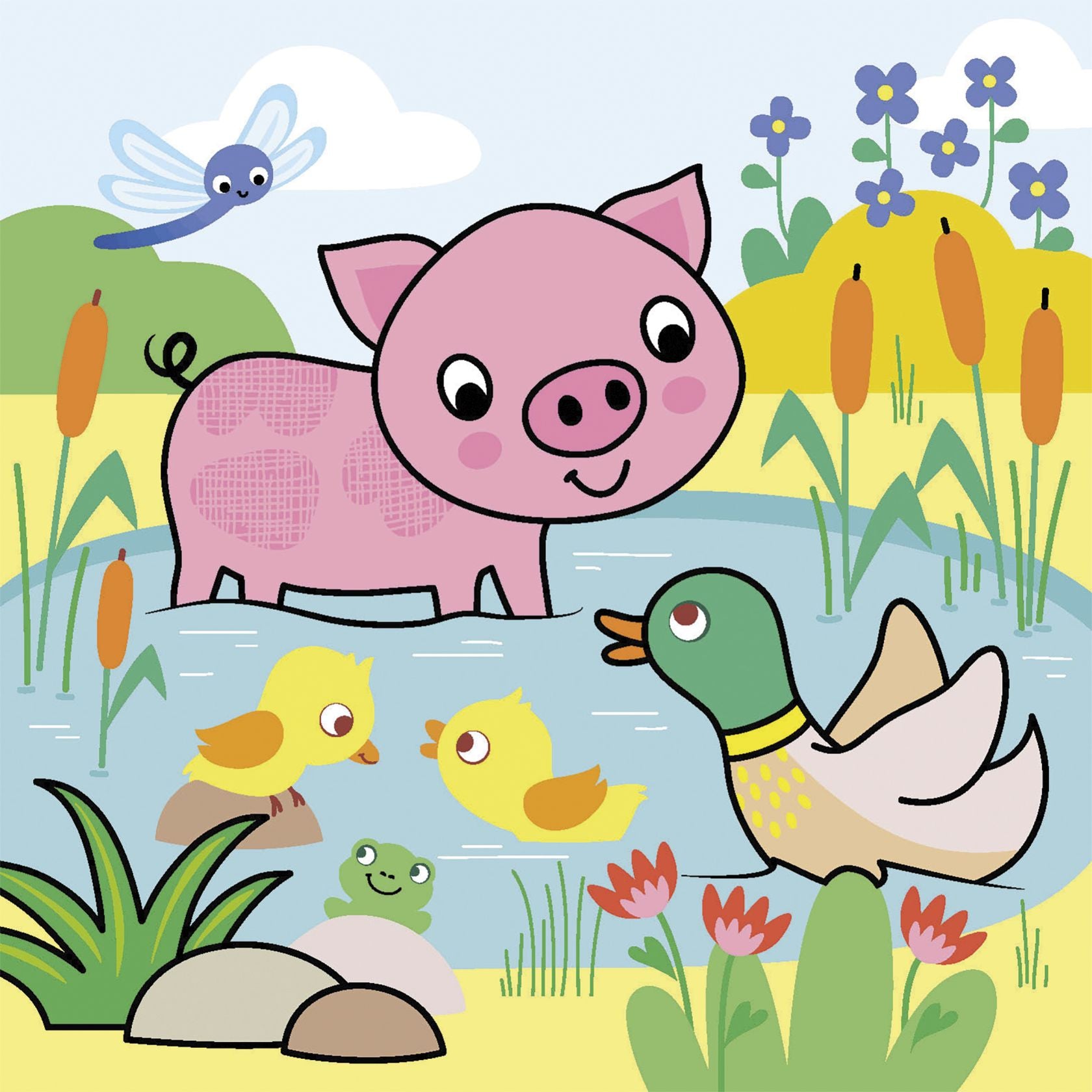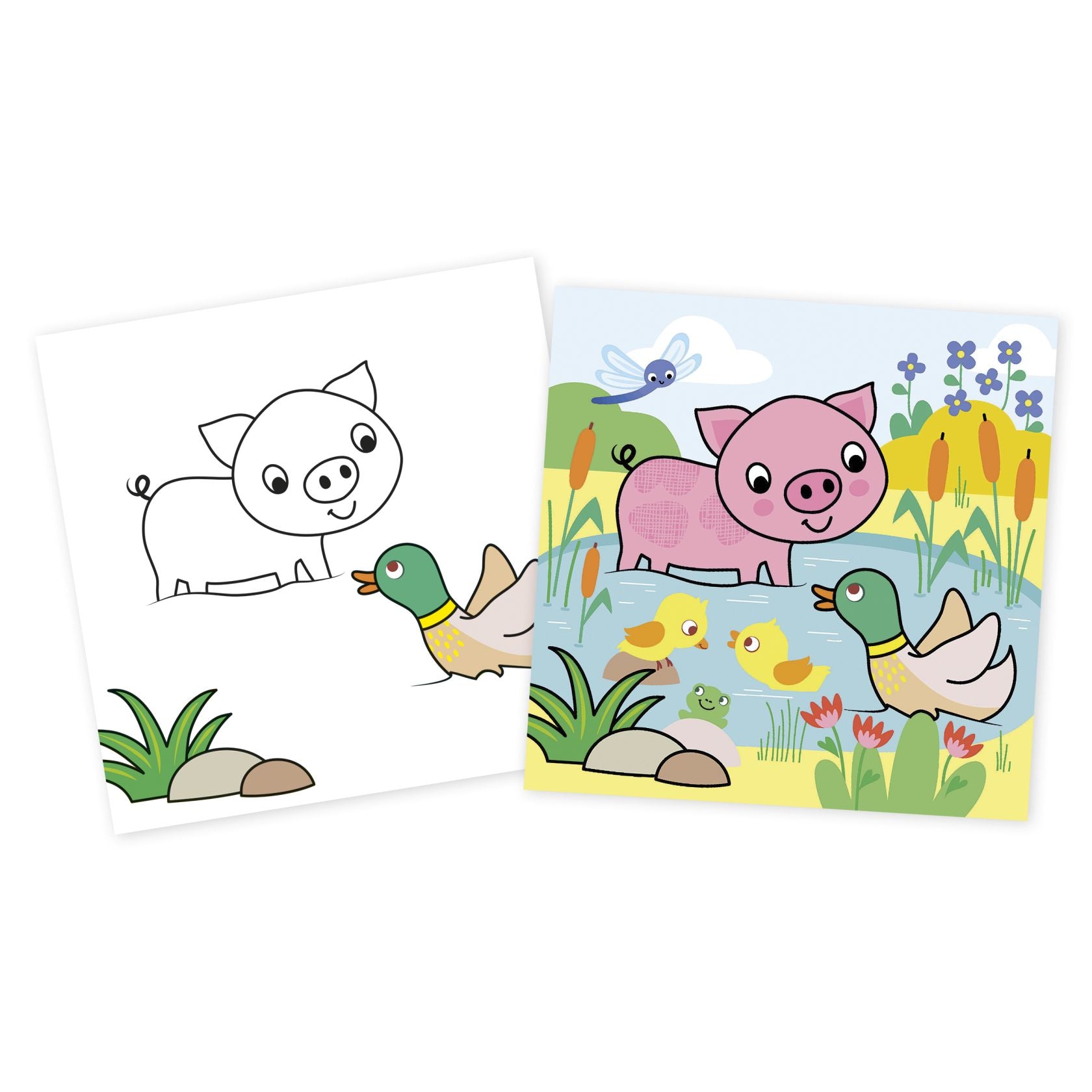 ¡Decora y colorea bonitos cuadros de animales! Este estuche de múltiples actividades permite realizar 4 cuadros para completar con tinta para dedos y 1 tampón, así como 2 cuadros anverso-reverso para colorear con un rotulador de agua.