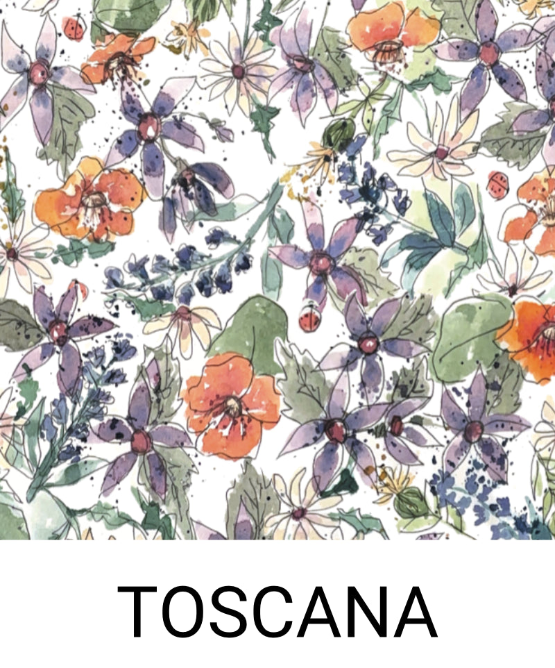 - Toscana – con flores en tonos morados y naranjas y cuadro Vichy en verde