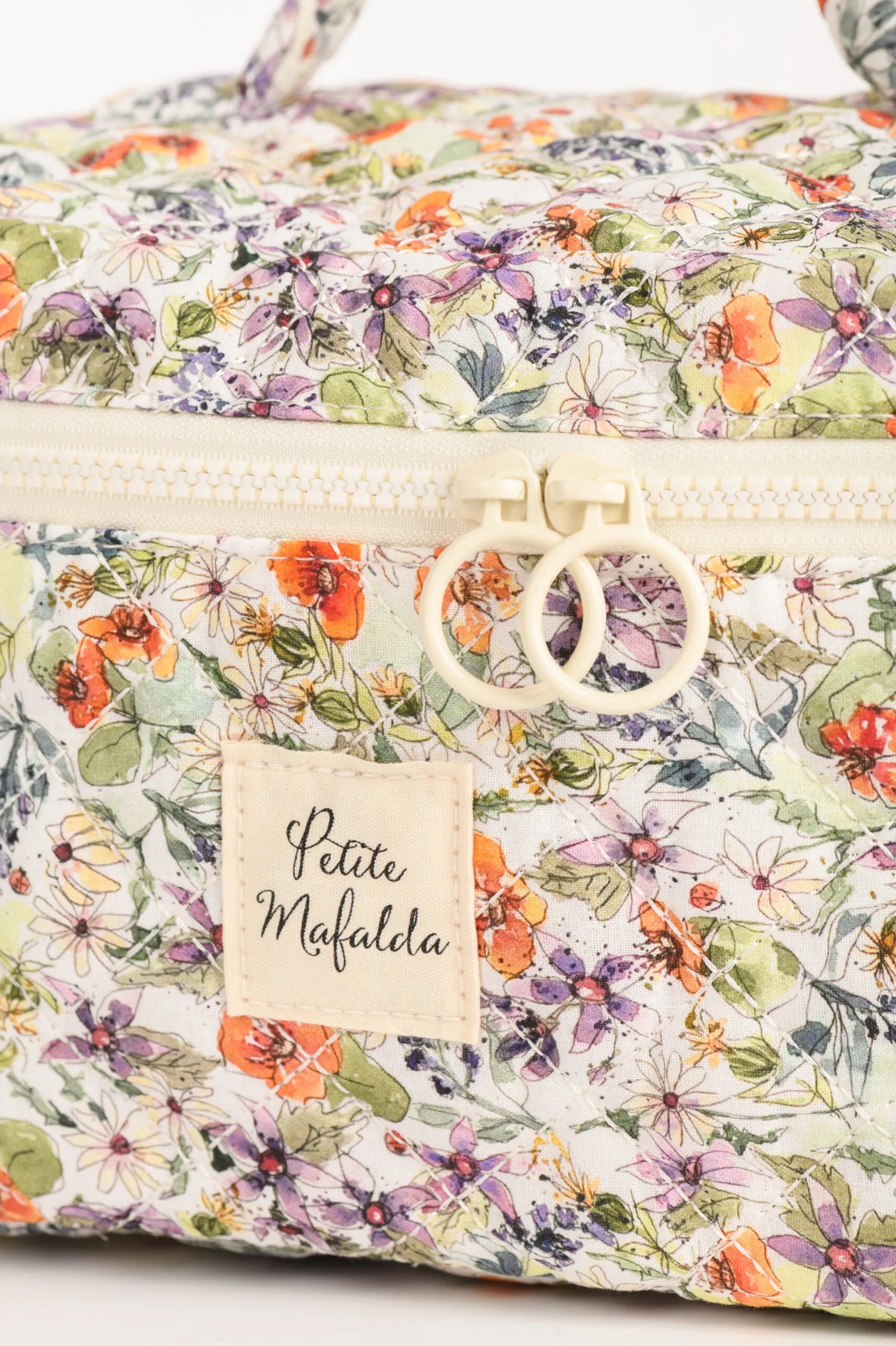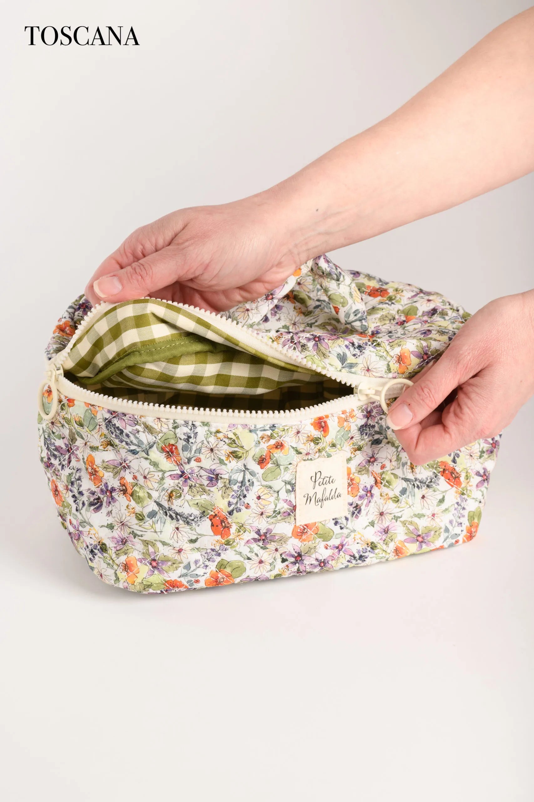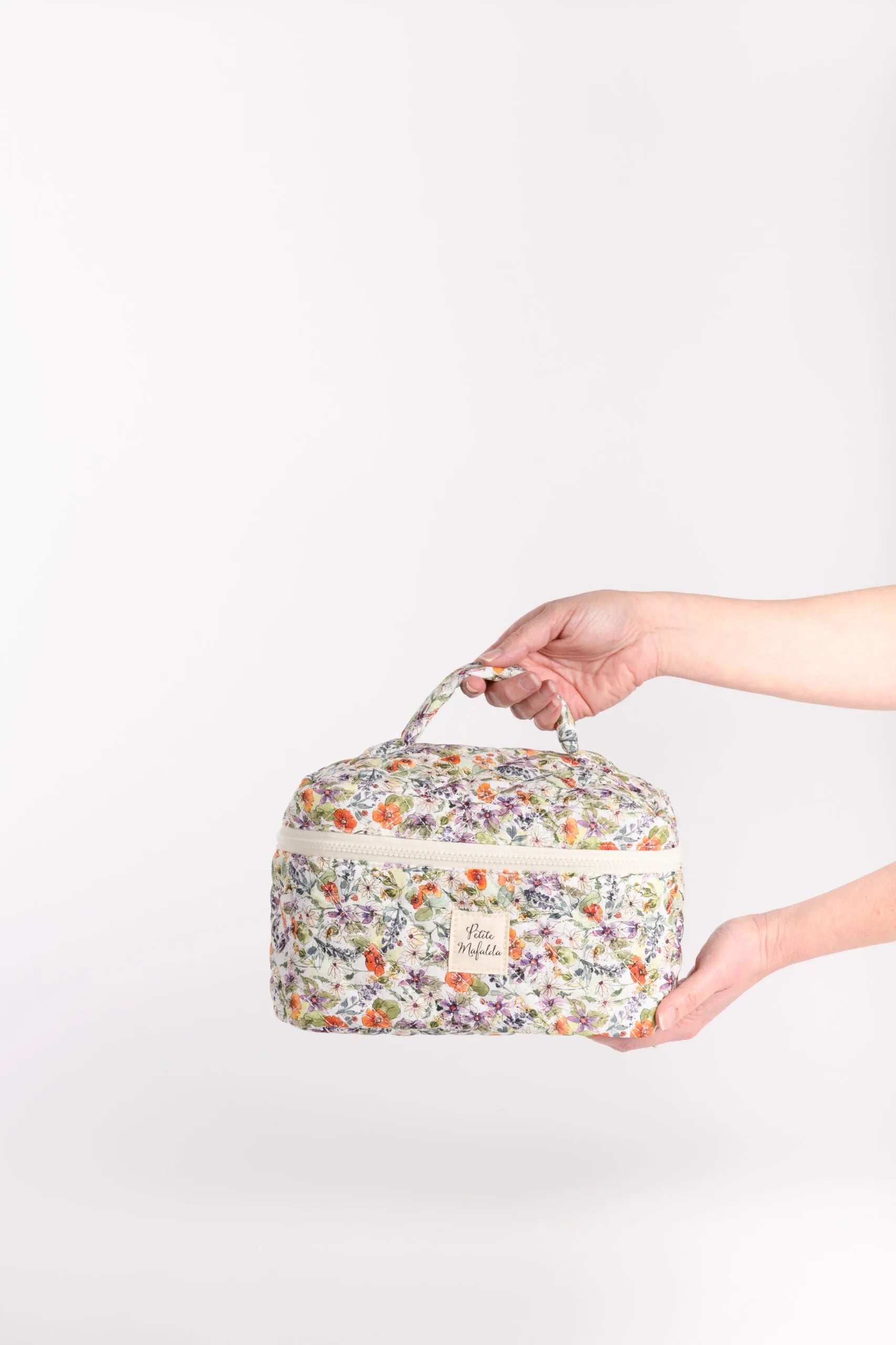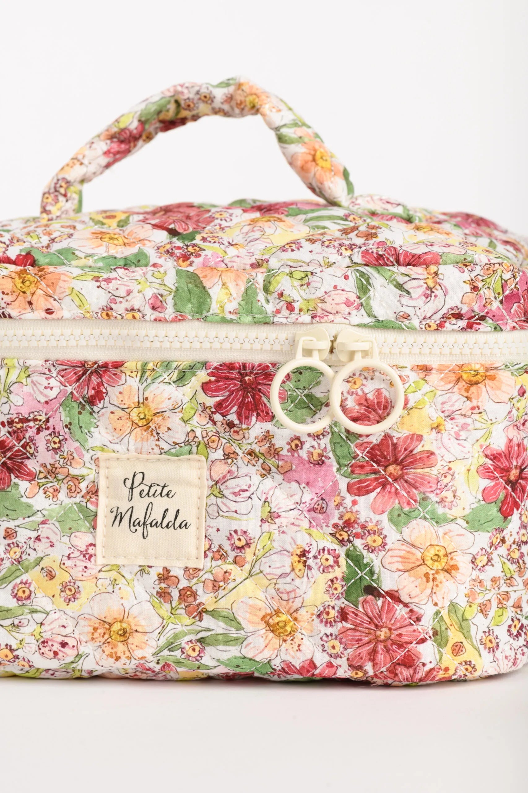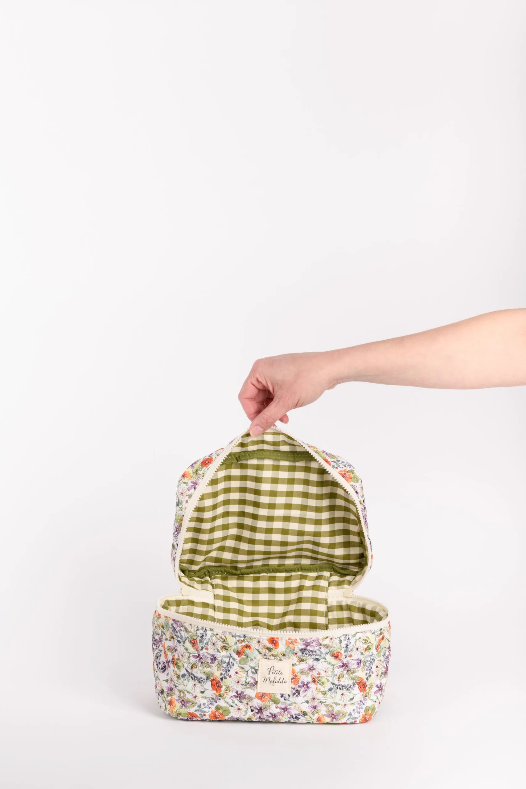 Neceser acolchado con dos de nuestros estampados de flores con interior en Vichy. Con un tamaño extra grande para poder llevar de viaje todo lo que necesites.
