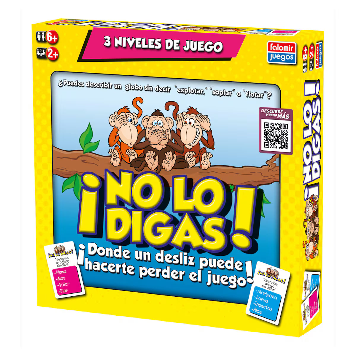 El juego "No lo digas" de Falomir Juegos es una propuesta para disfrutar en grupo, diseñada para 2 a 8 jugadores. Los equipos compiten para acumular puntos describiendo objetos sin mencionar palabras prohibidas. Cada acierto permite obtener tarjetas, pero mencionar alguna palabra prohibida resulta en la pérdida de todos los puntos acumulados. El juego incluye tres niveles de dificultad y un soporte con puerta corredera para facilitar el cambio entre niveles. Su contenido comprende 100 tarjetas, un soporte para las tarjetas, un temporizador, un bloc de puntuación, un lápiz y una hoja de instrucciones.