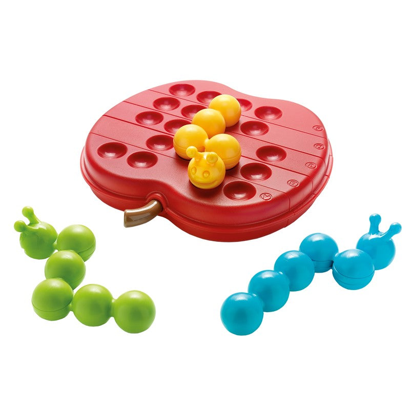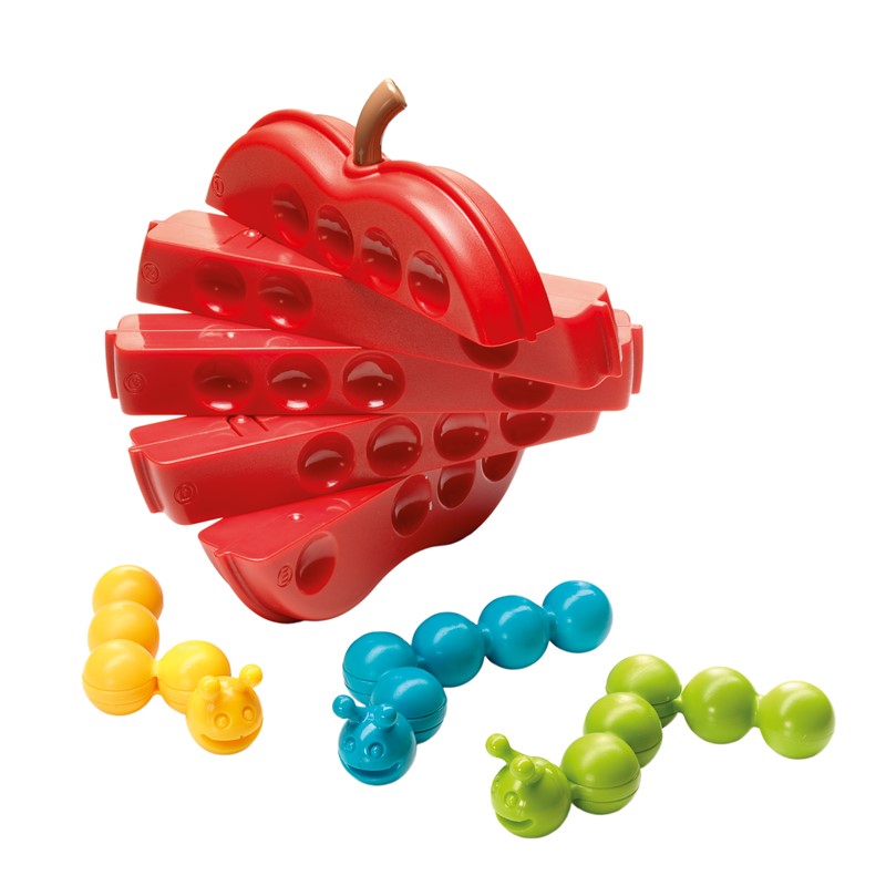 Tres orugas hambrientas quieren comer de la misma manzana. ¿Puedes doblarlas en la forma correcta?. ¡Este juego de lógica requiere un pensamiento flexible!. No solo las orugas son ajustables, ¡el tablero de juego con forma de manzana se puede girar!. Con 60 desafíos de fácil a experto, Orugas Comilonas ofrece mucho que comer ¡y qué pensar!.