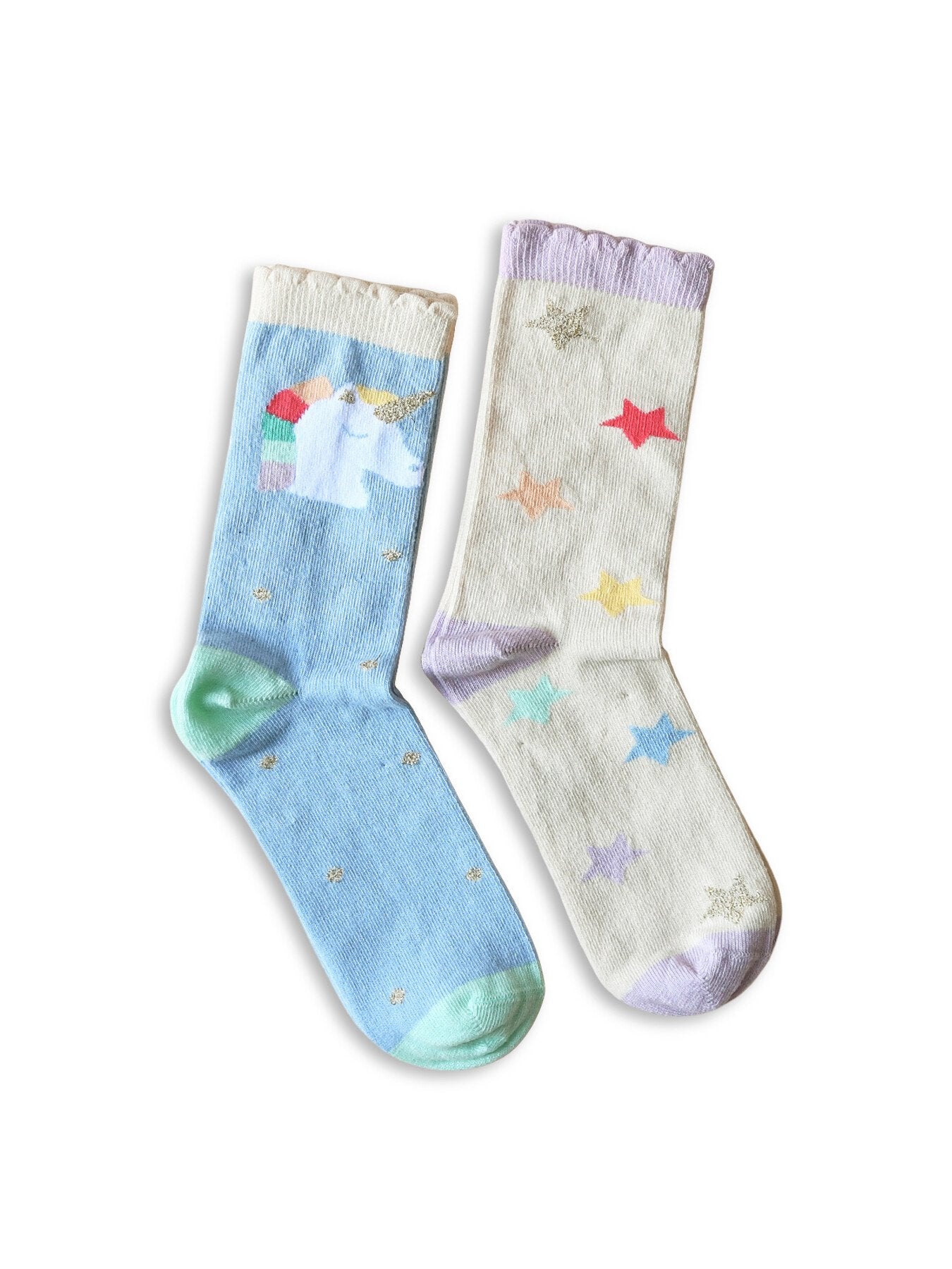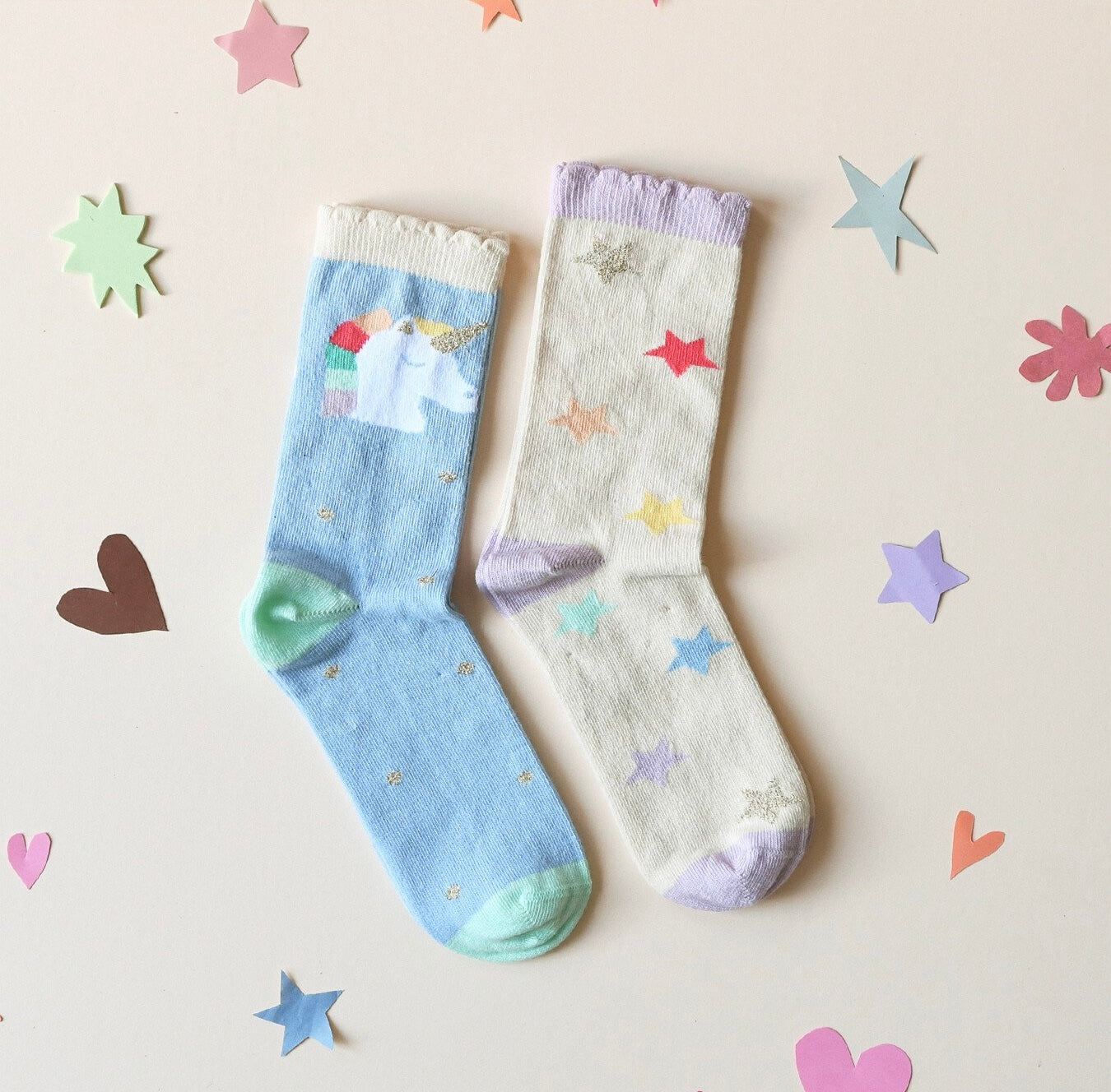¡Nuestro paquete de dos calcetines súper suaves presenta un unicornio con una brillante melena de arcoíris y un brillante estampado de estrellas de arcoíris! Confeccionados con algodón orgánico, son perfectos para las actividades diarias. ¡Combina con nuestra colección de unicornios arcoíris para obtener el combo perfecto!