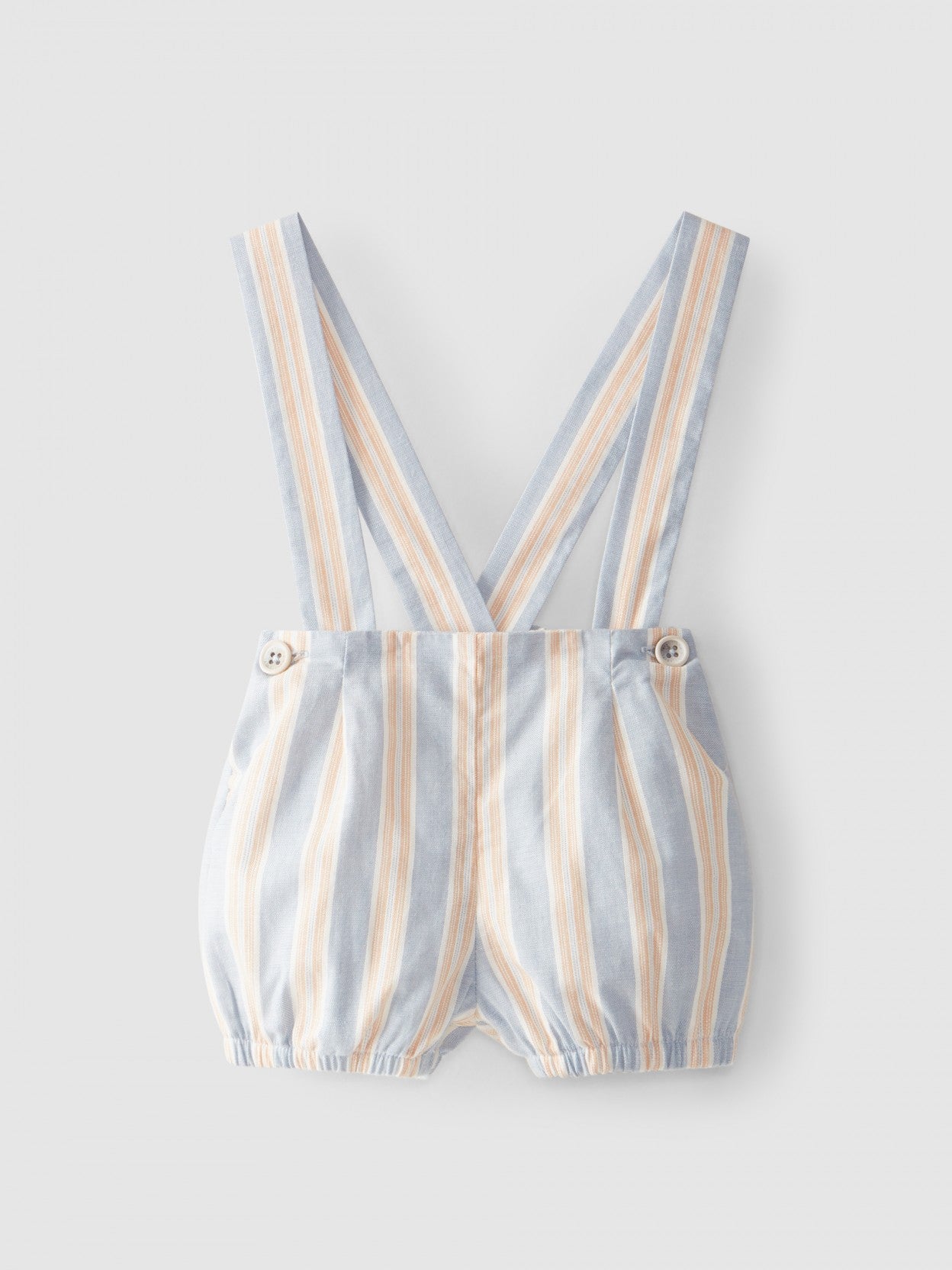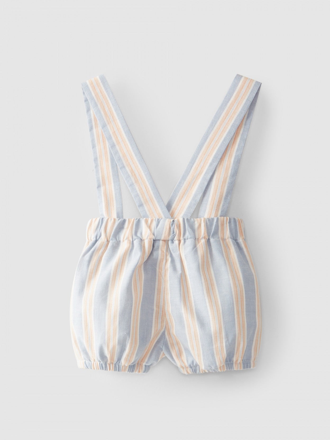 Pantalón corto de tirantes en tejido 100% algodón con estampado de rayas. Las correas desmontables se aprietan en dos posiciones para mayor durabilidad. Cintura elástica y botones laterales. Elástico en las piernas.