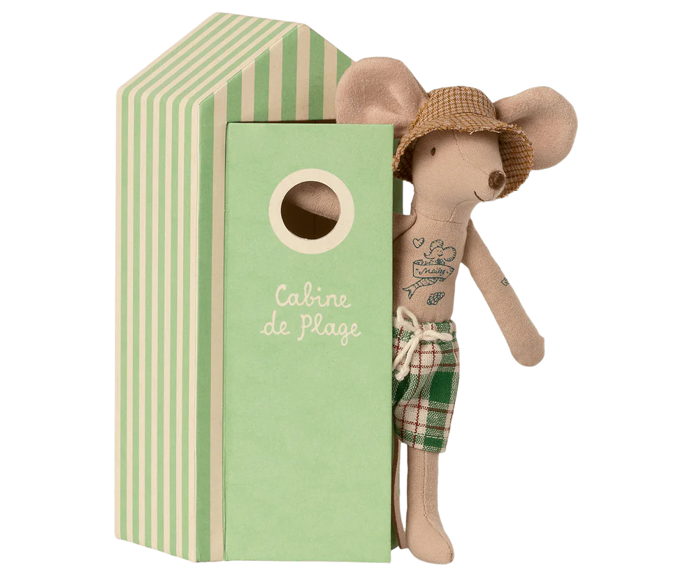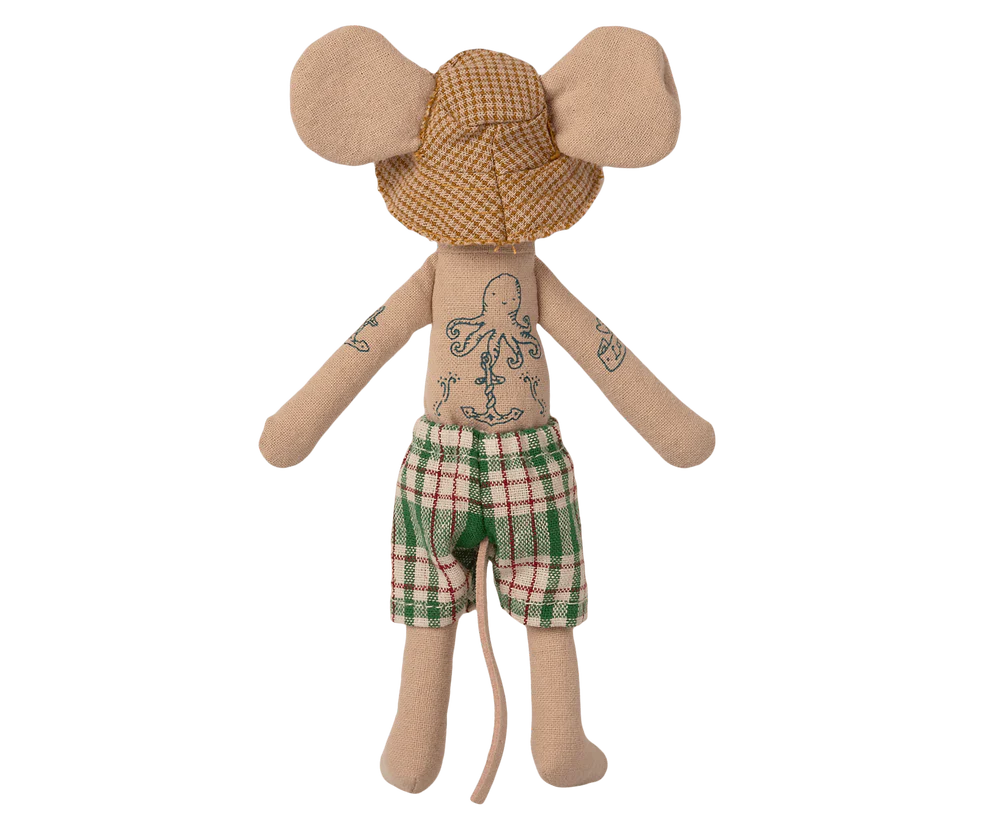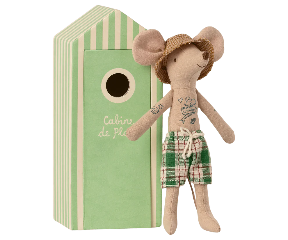 Tiempo de vacaciones. Este ratón está listo para un día de playa, con todos los accesorios necesarios y una hermosa casa de playa a rayas.