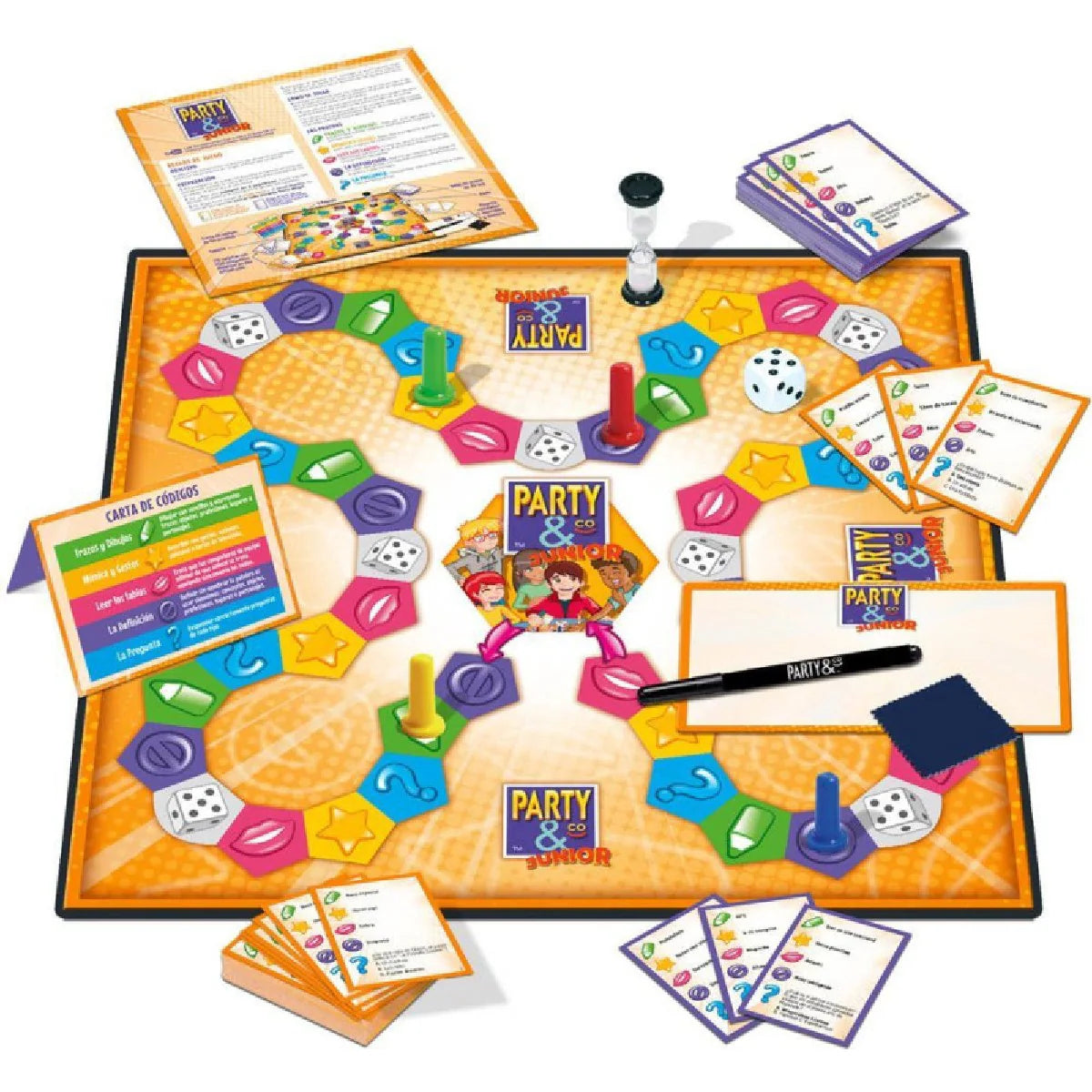 Party & Co Junior es un juego de mesa que fomenta la diversión y el trabajo en equipo. Los participantes deben superar diversas pruebas para avanzar en el recorrido. Incluye cinco tipos de pruebas con dos niveles de dificultad, tales como trazos y dibujos, mímica y gestos, lectura de labios, definiciones y preguntas. Permite la participación de hasta cuatro equipos, cada uno con dos jugadores. El contenido del juego incluye 112 tarjetas con un total de 1120 pruebas y preguntas, un tablero, cuatro peones, un dado, un reloj de arena, una carta de códigos, una pizarra, un rotulador borrable, una gamuza y las instrucciones para jugar.
