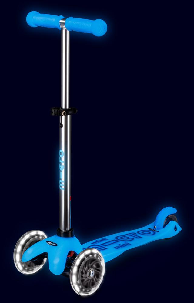 El Mini Micro ha sido elegido numerosas veces juguete del año por padres y madres. Este juguete deportivo no solo fomenta el movimiento y el ejercicio, sino que también ayuda a los niños a mejorar el equilibrio, la coordinación y las habilidades motoras finas. El manillar diseñado en forma de T hace más segura su conducción y dispone de un cierre de seguridad que hace que solo los adultos puedan desmontarlo para guardarlo. Dispone de un sistema de giro por inclinación patentado. La plataforma está fabricada con fibra de vidrio lo cual le otorga resistencia y flexibilidad. Además incluye letras de goma en relieve que son antideslizantes facilitando el manejo del patinete y dando seguridad extra a nuestros pequeños. Incorporan unas ruedas LED que funcionan a través de una dinamo, por lo que no requieren de baterías, sino que funcionan solo cuando nos movemos. Emiten una brillante luz blanca que, además de ser divertida para nuestros pequeños, les da seguridad al ser vistos con mayor facilidad en momentos de oscuridad. Por ultimo y en absoluta primicia, tanto la plataforma como los puños y el logo del manillar brillan en la oscuridad. La luz ultravioleta del ambiente diurno carga esos componentes y al llevarlos a la oscuridad hacen que el patinete que de día tiene un tono pastel adquiera un tono neon brillante