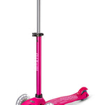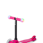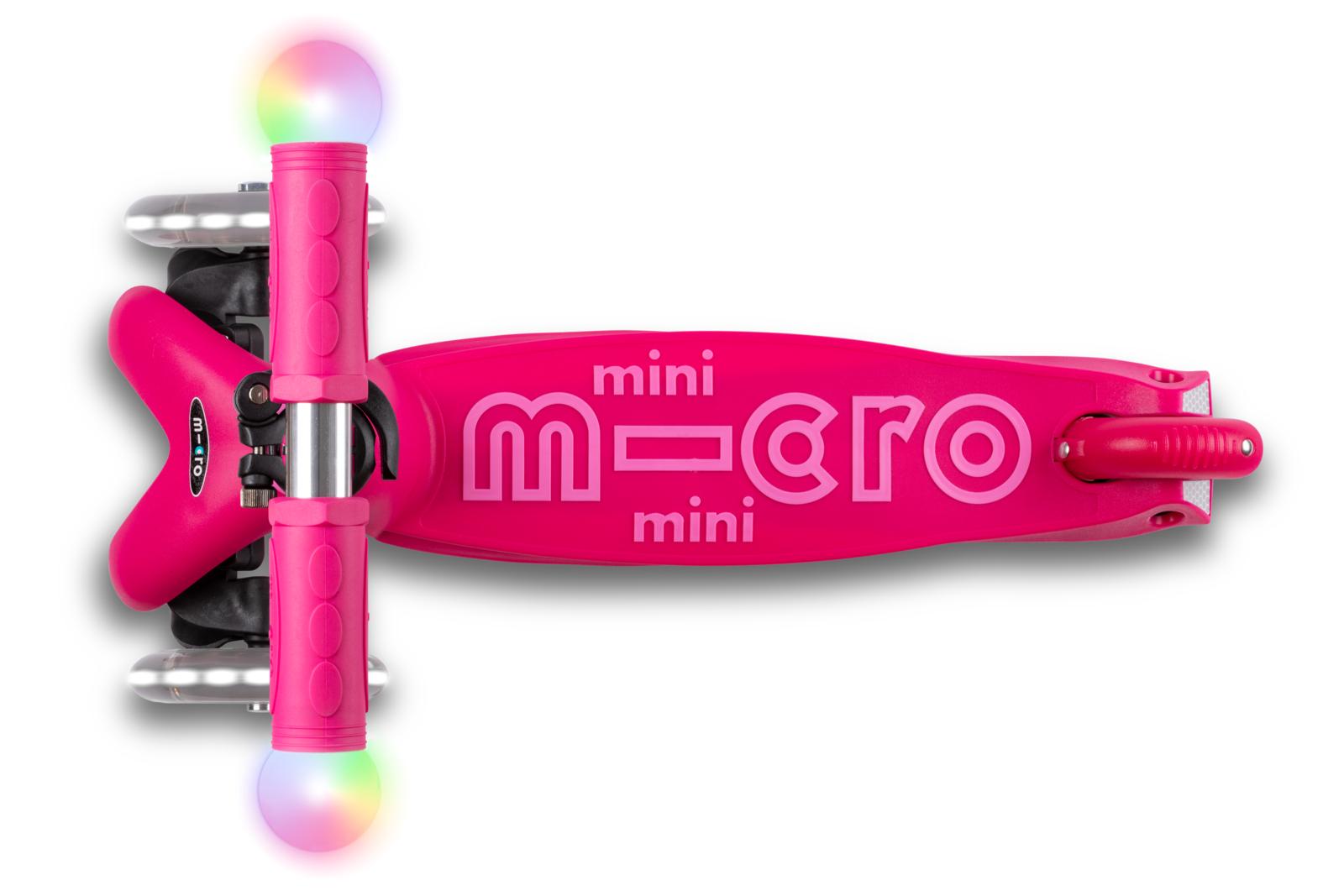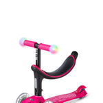 El innovador y ergonómico patinete todo en uno se puede utilizar en diferentes variantes: al principio con asiento, dos opciones de reposapiés y barra de empuje para los padres, posteriormente sin barra de empuje, como una mezcla entre bicicleta de equilibrio y patinete y finalmente como un Mini Micro Deluxe clásico con luces LED mágicas en los extremos del manillar y ruedas lunares LED.