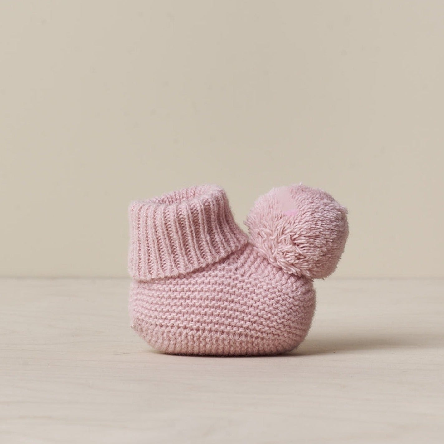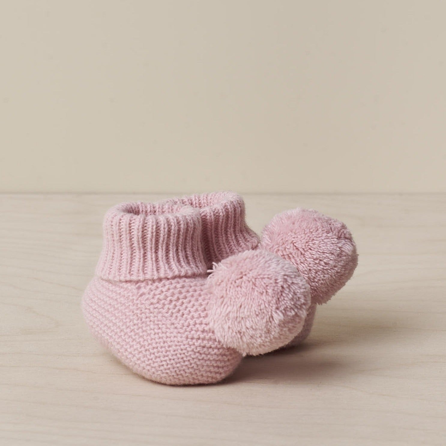 Patucos con pompones con tejidos en suave mezcla de lana merino y cashmere, ideales para bebés niños y niñas de hasta 24 meses.