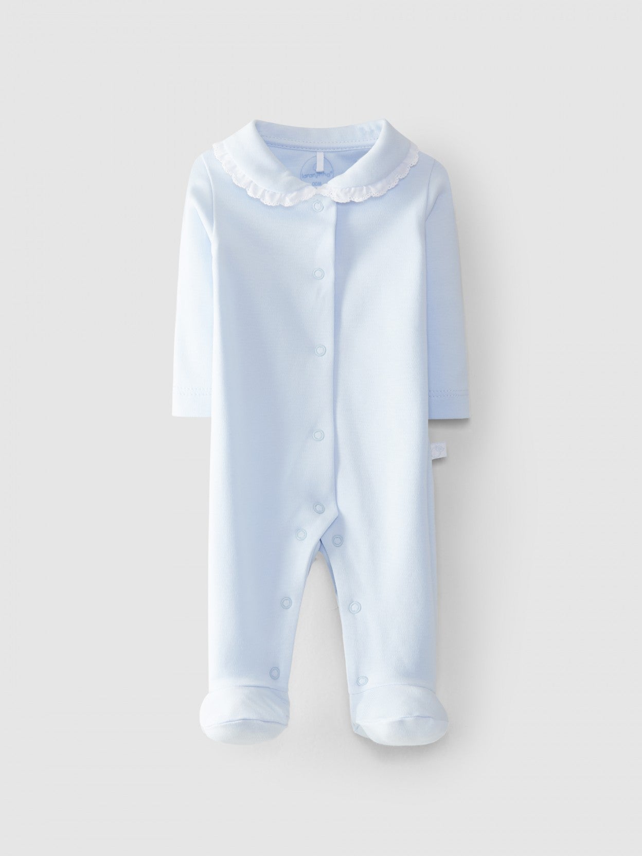 Pelele en tejido antibacterial 100% algodón con cuello redondo y detalle de encaje. Cierra al frente con botones de presilla de color a todo lo largo y en la zona interior de las piernas.