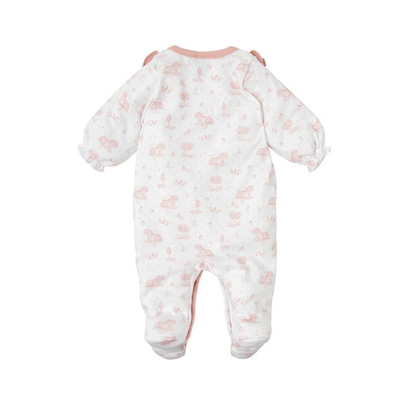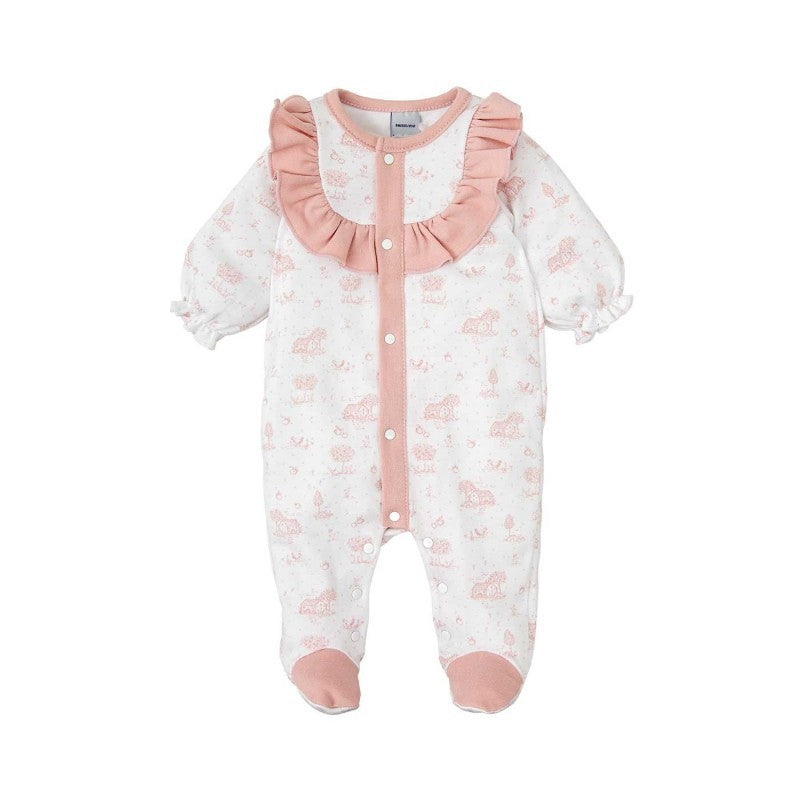 Pelele de bebé niña con microestampado. Con cierres automáticos hipoalergénicos que facilitan el cambio del bebé. Confeccionado con 100% algodón, pelele ultra suave y delicado, ideal para la piel sensible de los bebés. Además, es transpirable, asegurando que tu bebé esté cómodo y fresco en todo momento.