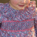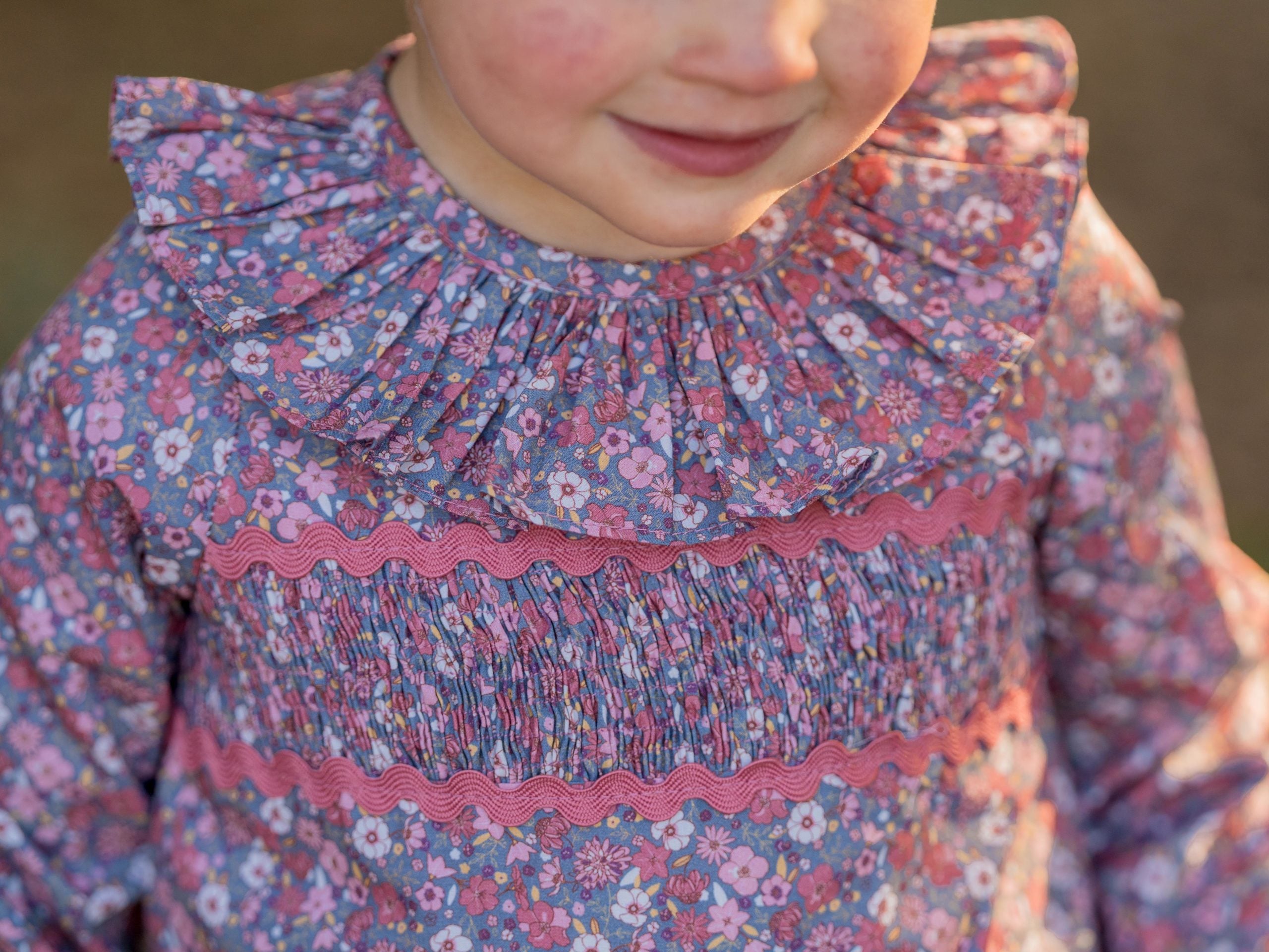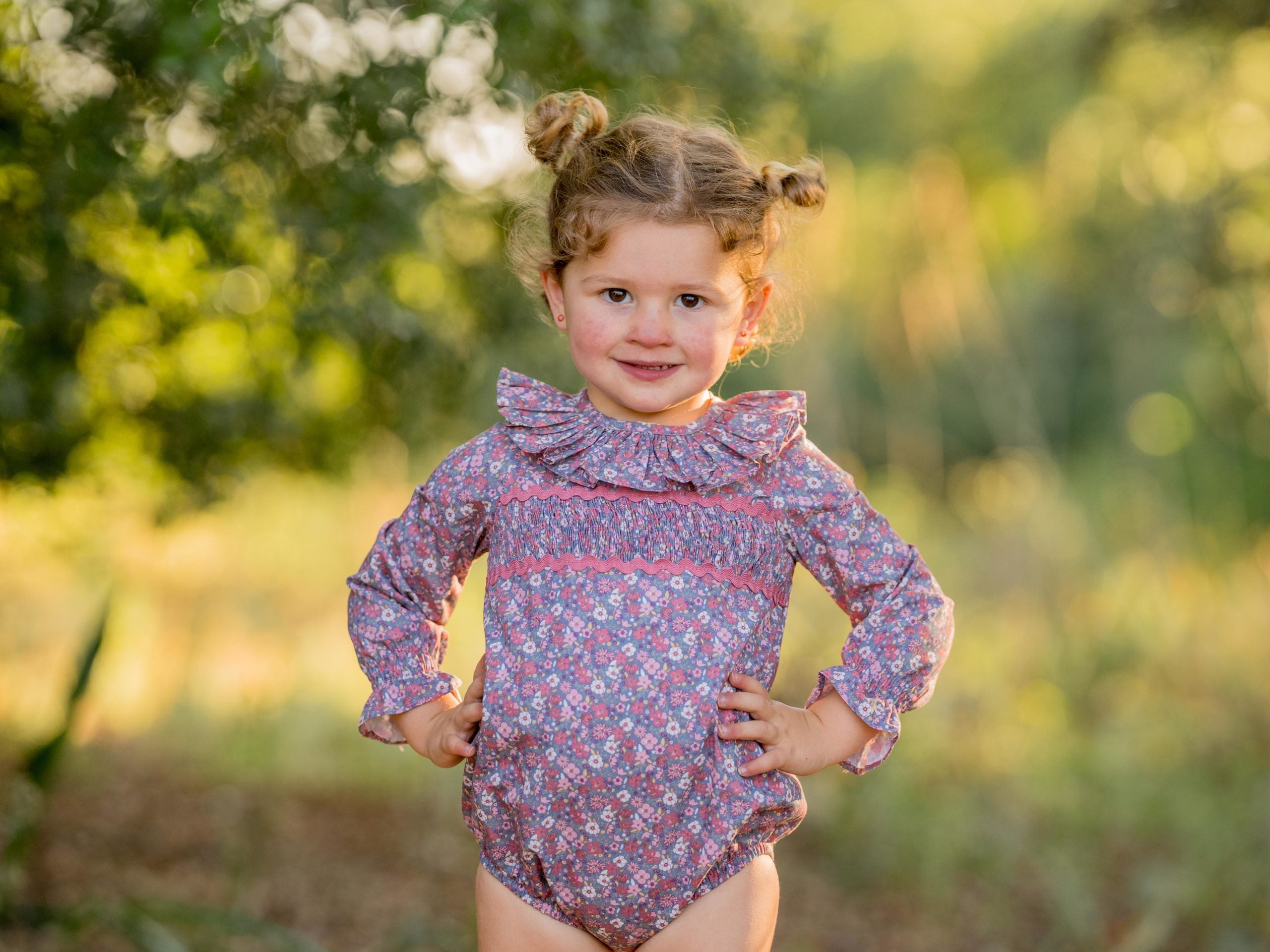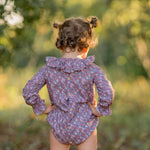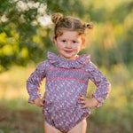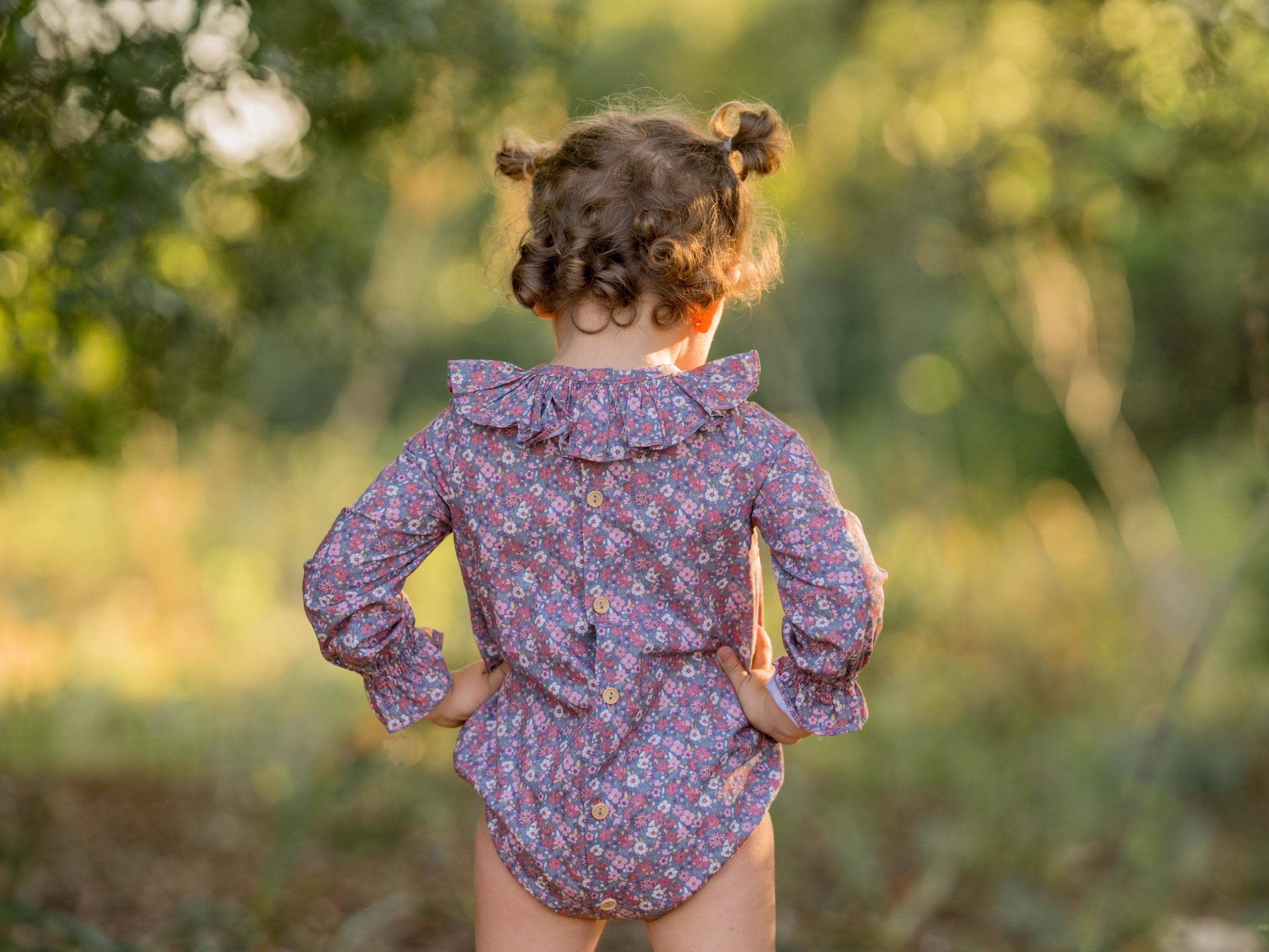 Pelele de flores en tejido EXCLUSIVO para MIJI con pecherín engomado y terminado en ondulina marsala y cuello volante.