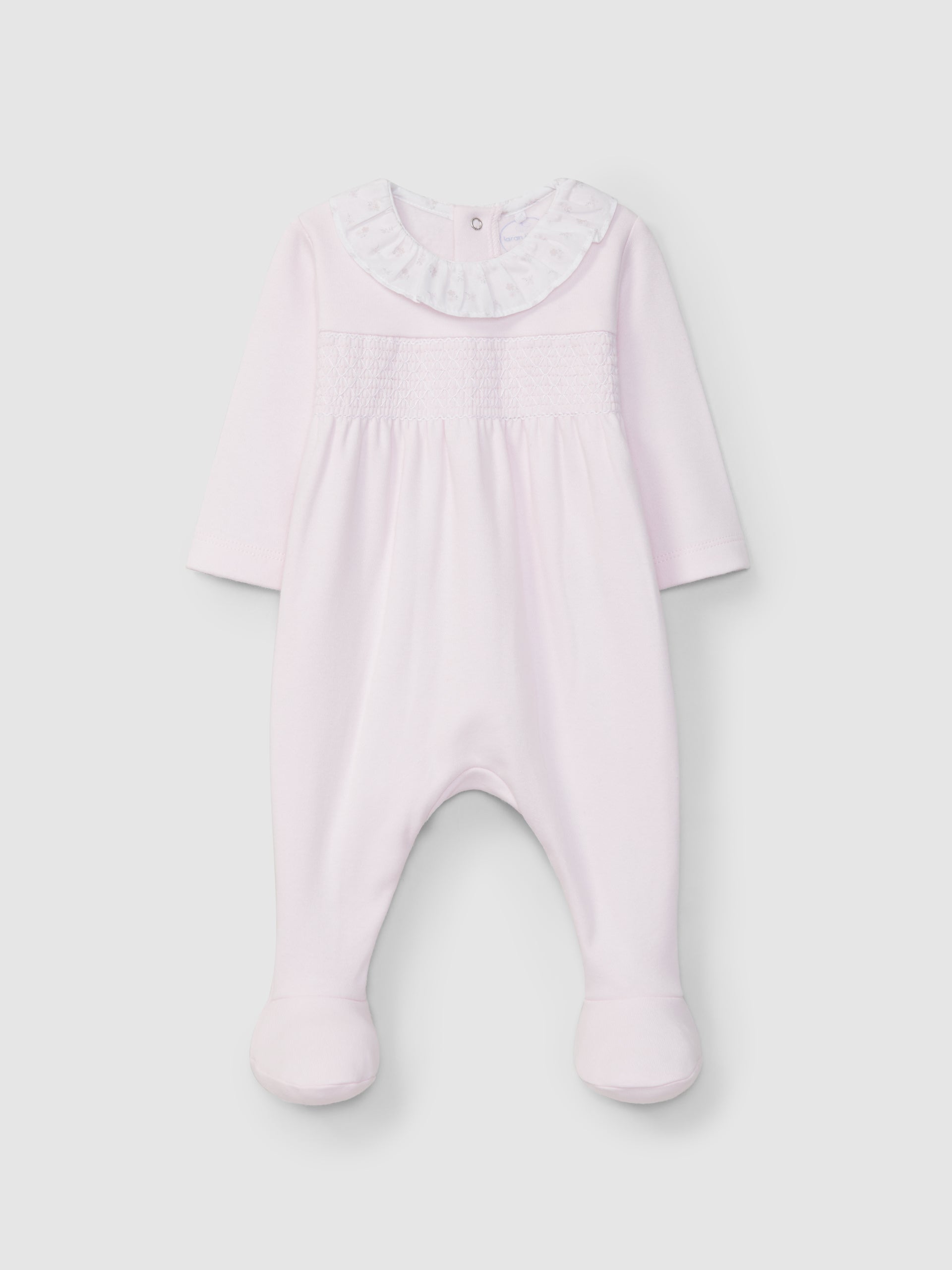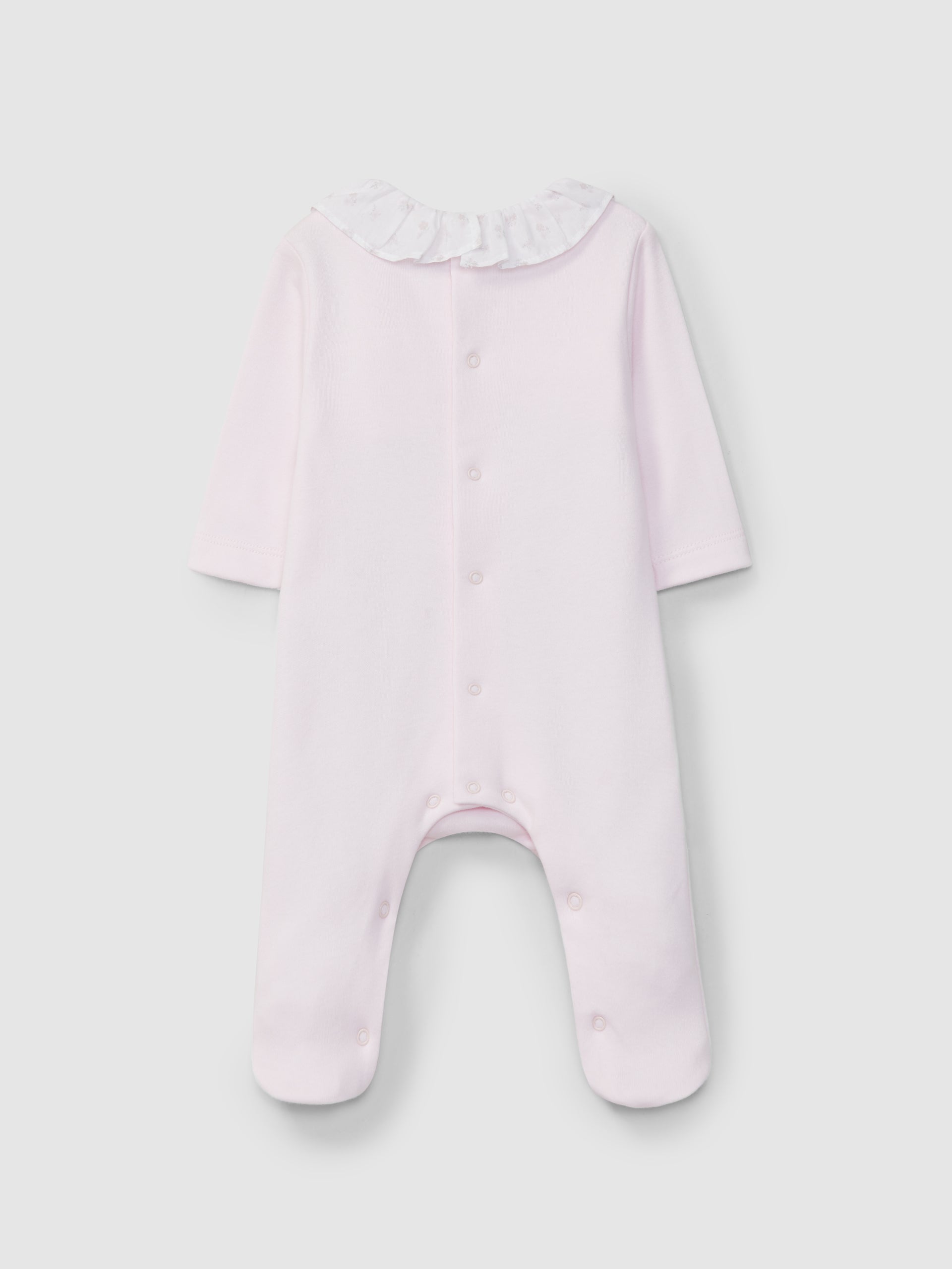 Body de bebé en jersey 100% algodón cardado con cuello fruncido en tejido de flores. Detalle de fruncido en el pecho. Cierre con botones automáticos en la espalda y entre las piernas.