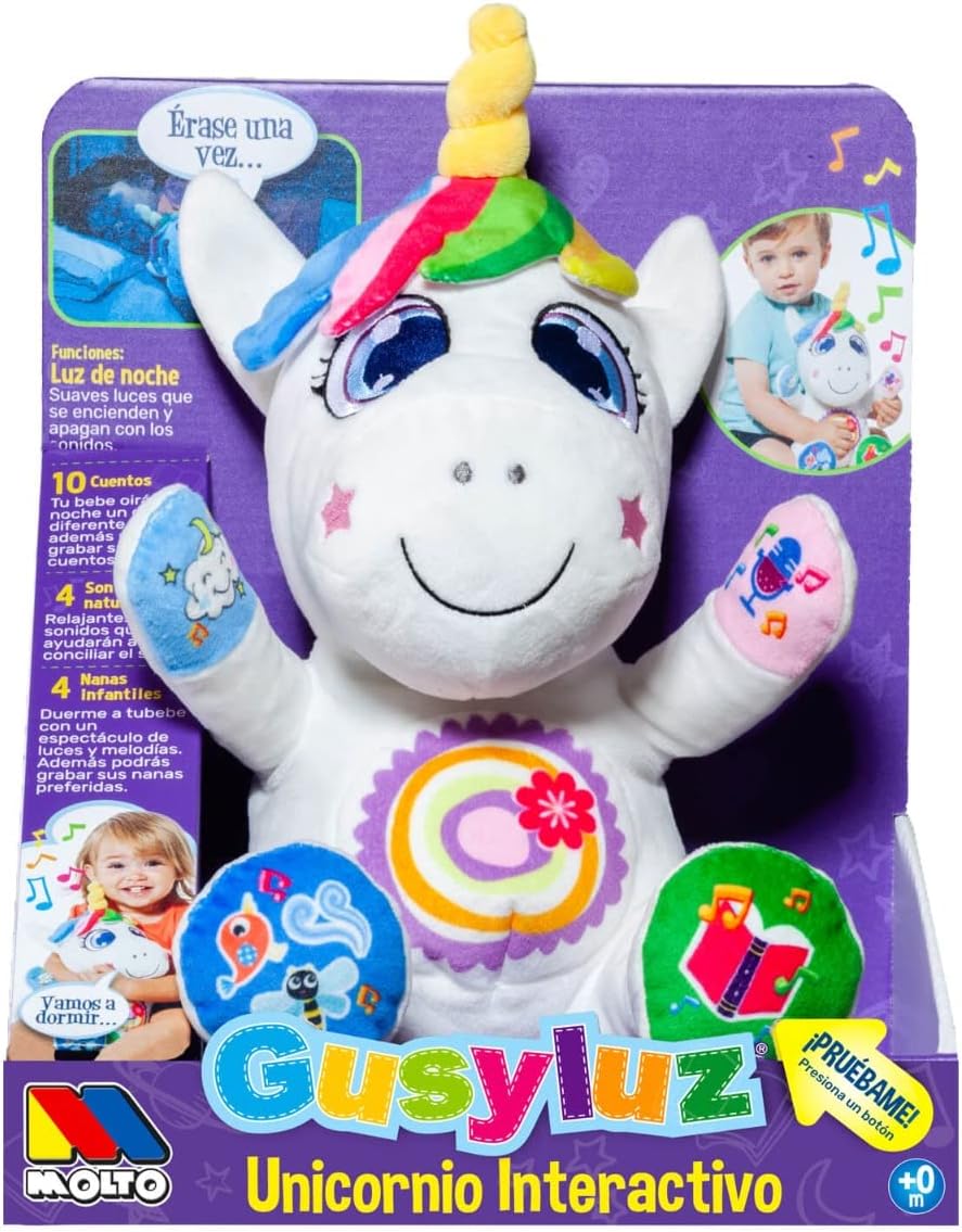 Descubre nuestro Gusy Luz Unicornio Interactivo original de la marca Molto, es el compañero perfecto para achuchar por las noches.