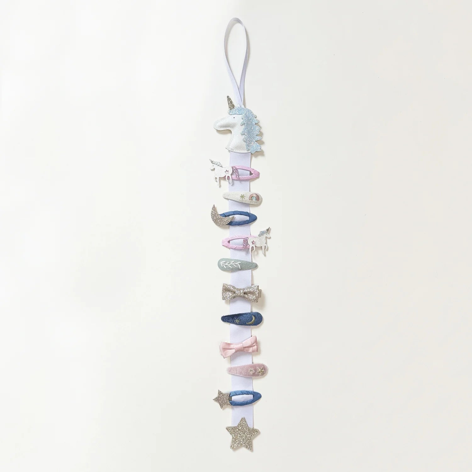 ¡La solución perfecta para mantener las pinzas para el cabello guardadas de forma segura en un solo lugar! Con un hermoso arcoíris de tela en colores suaves y cuatro tiras para colgar unidas a una barra de madera, nuestro colgador de gotas de arco iris puede contener alrededor de 52 clips (dependiendo del tamaño del clip) y cuelga perfectamente de un lazo de cinta de grosgrain.