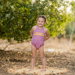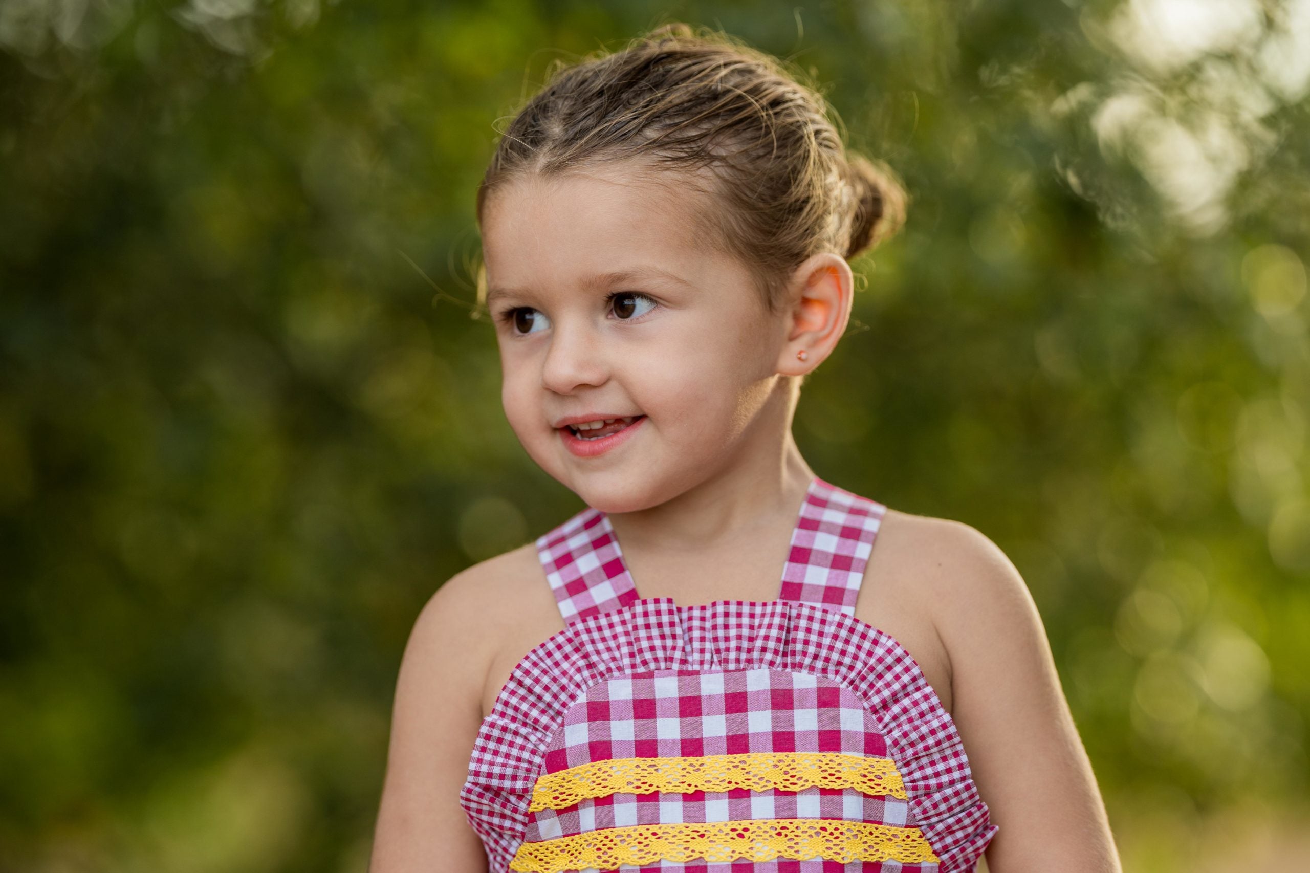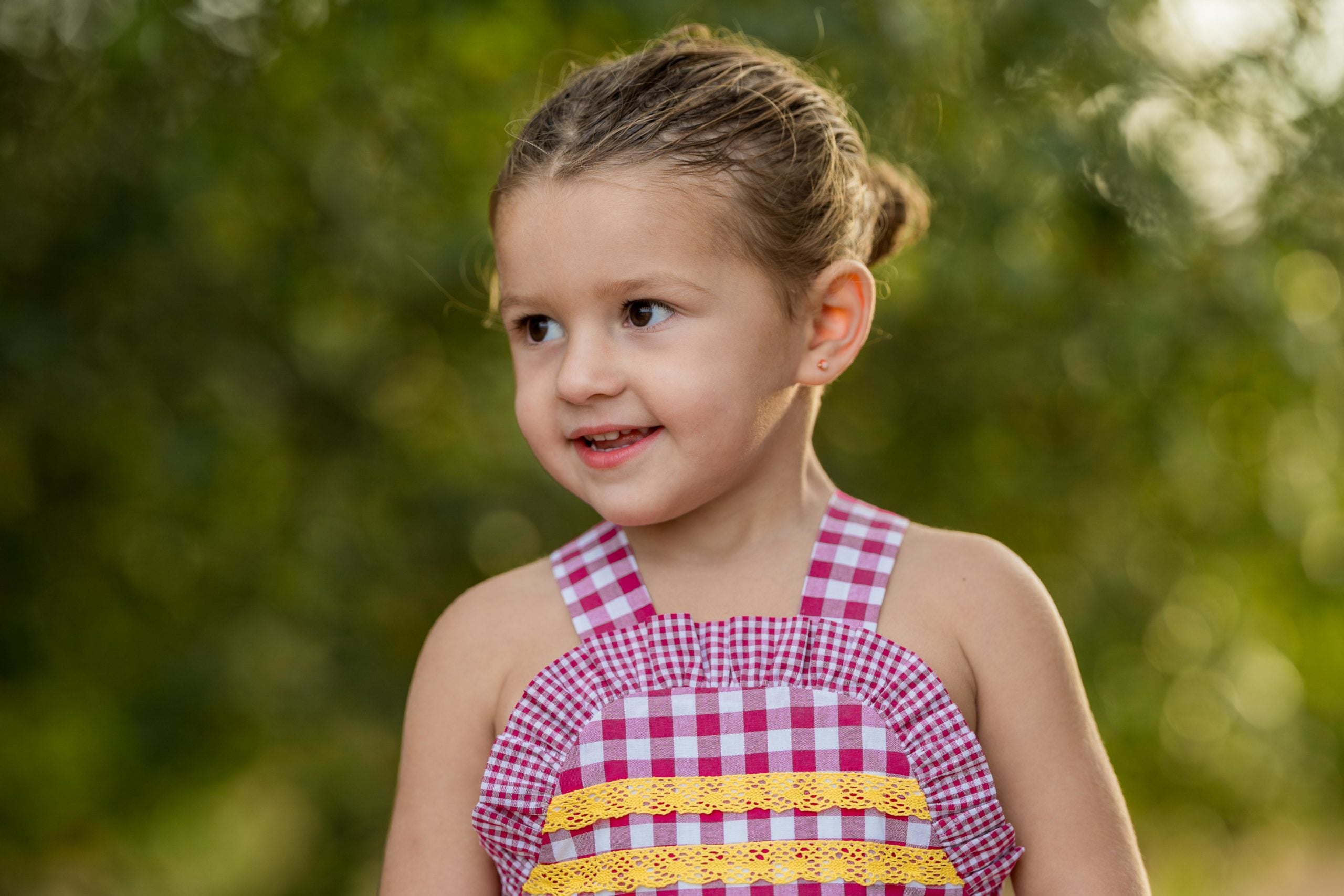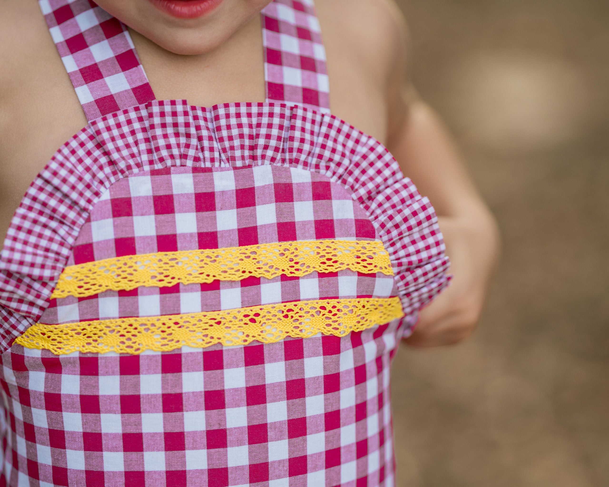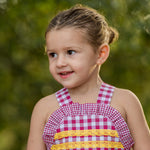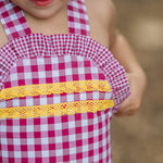 Espectacular peto en tejido cuadros frambuesa con vonlantito. En su pecherín lleva 2 pasamanerias en tono amarillo mostaza.