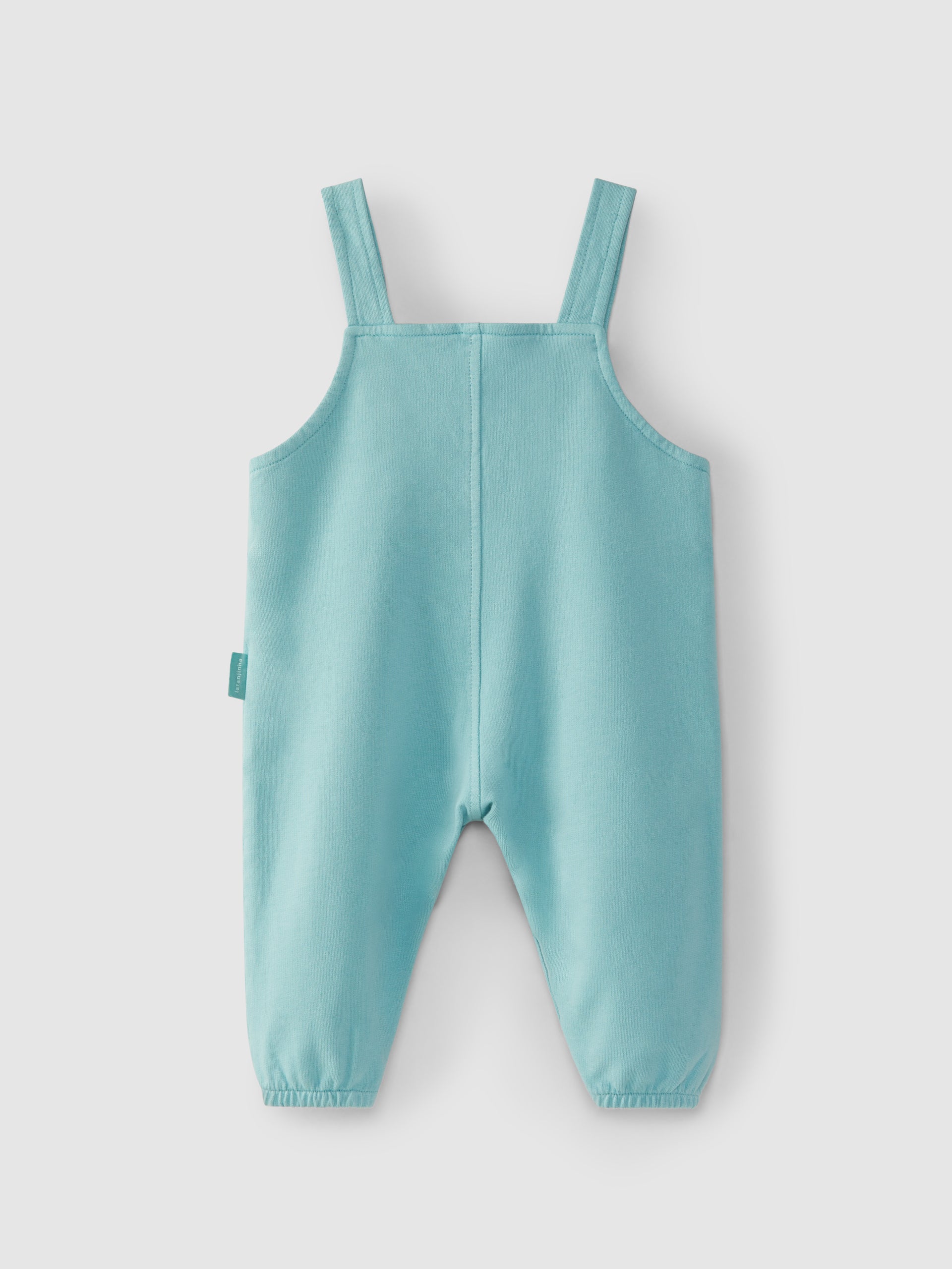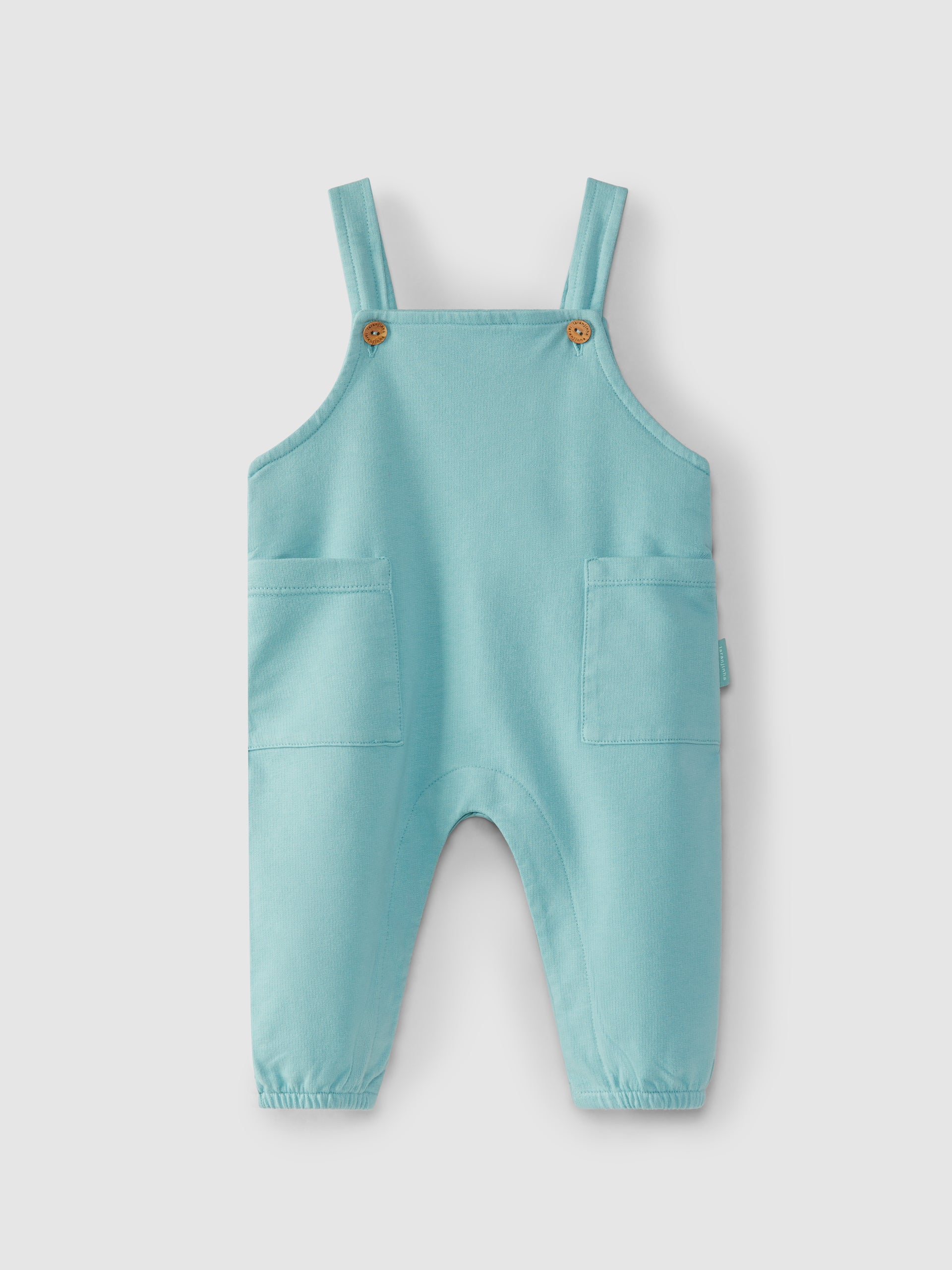 Peto de felpa con bolsillos laterales. Se ajusta con botones de madera Laranjinha en dos medidas en los tirantes. Aberturas en los laterales con clips para facilitar el vestir del bebé. Cierra con clips en la entrepierna también hasta los 12 meses.