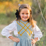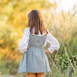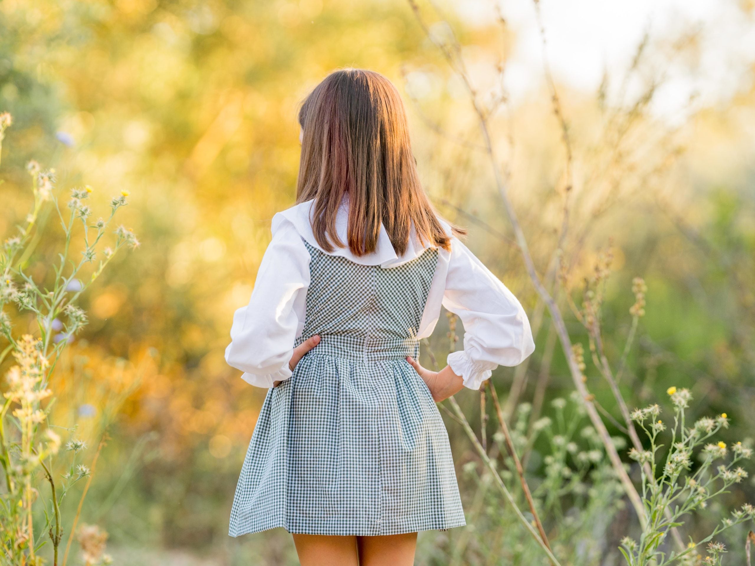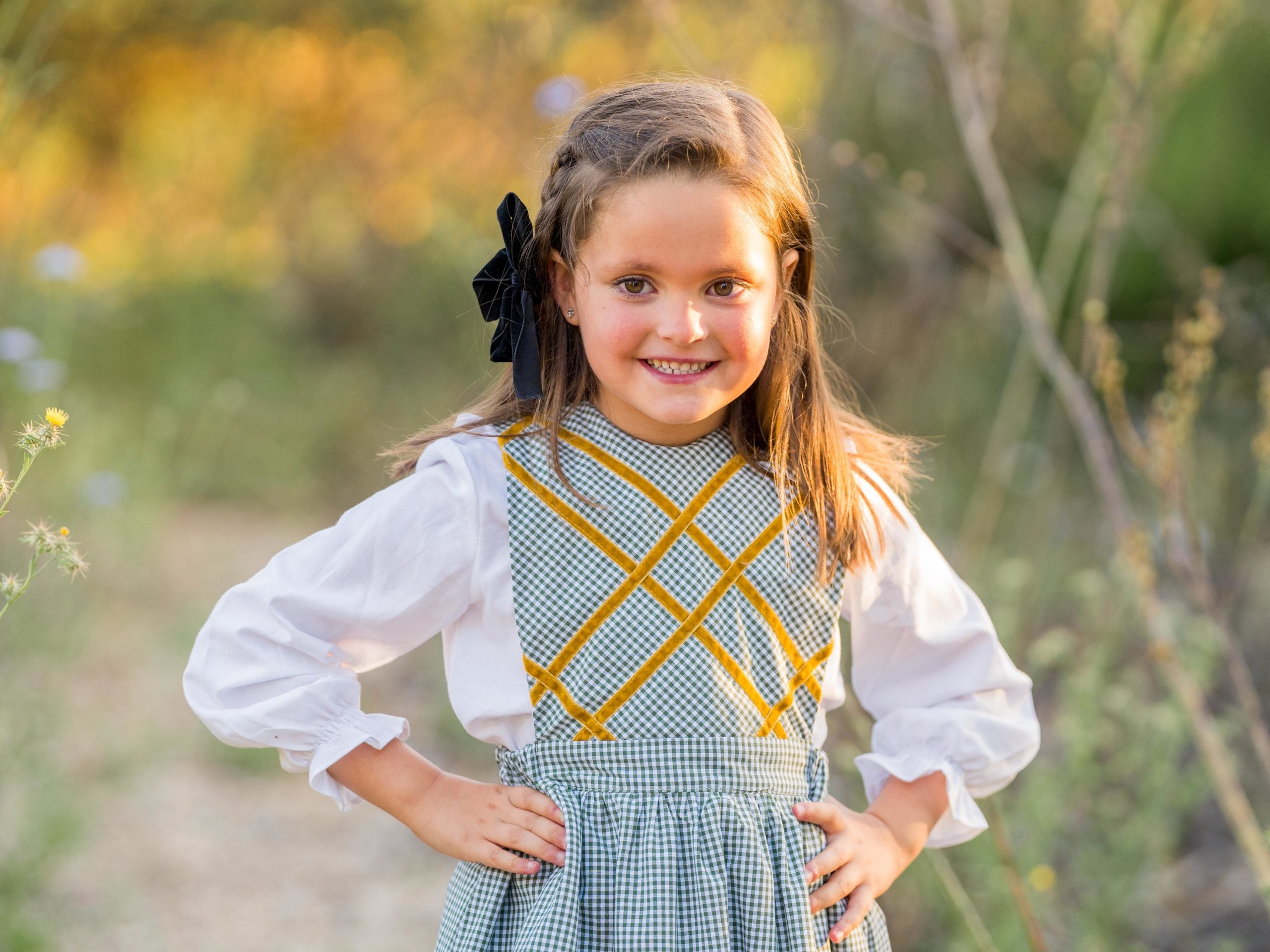 Espectacular pichi de cuadros verdes con pecherín de rombos de terciopelo mostaza.