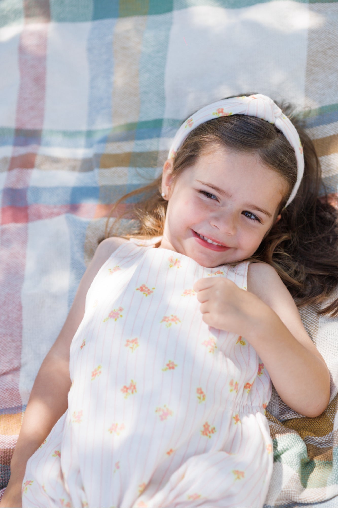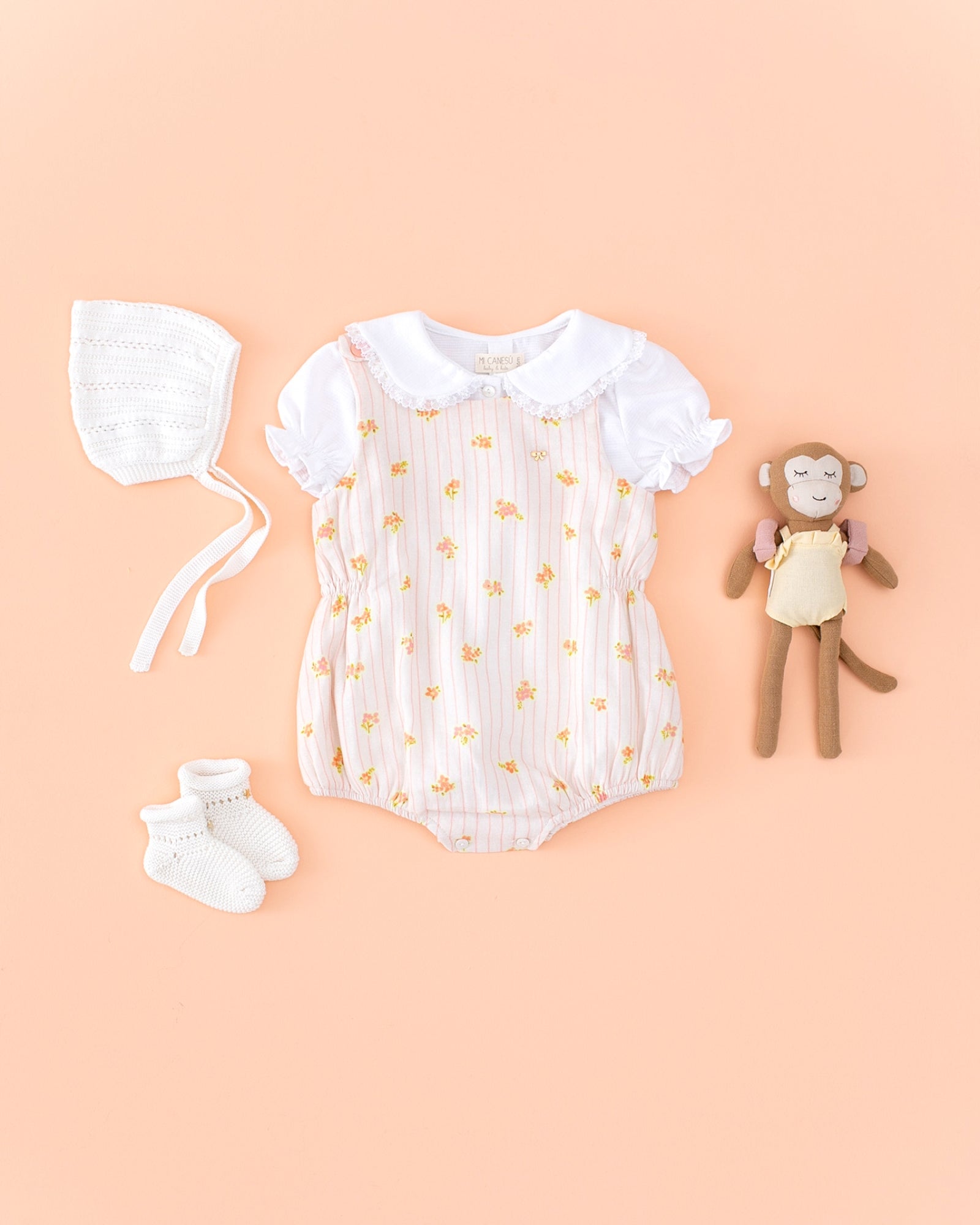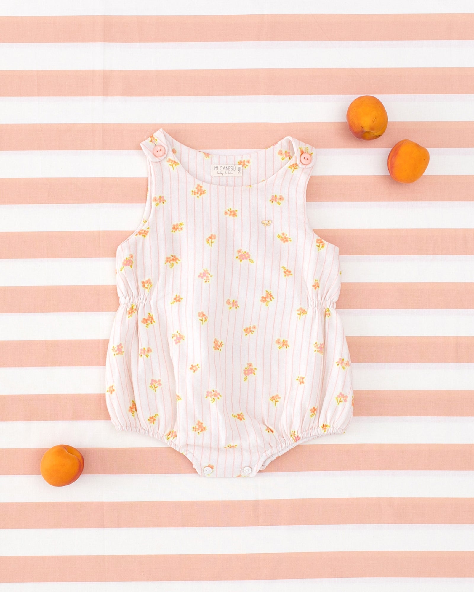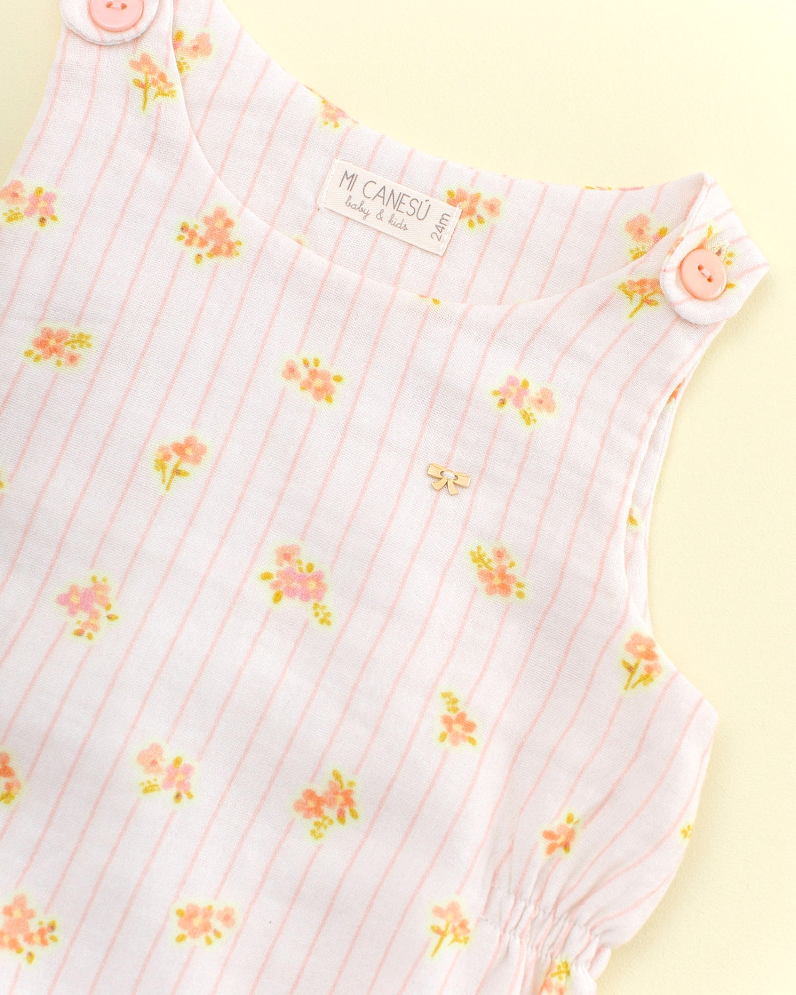 Pinocho de bebé en tejido gasa Flor Silvestre exclusivo de Mi Canesú.Lleva elásticos en los laterales de la cintura para dar un poquito de forma. En la parte inferior va abotonada para facilitar el cambio del pañal.