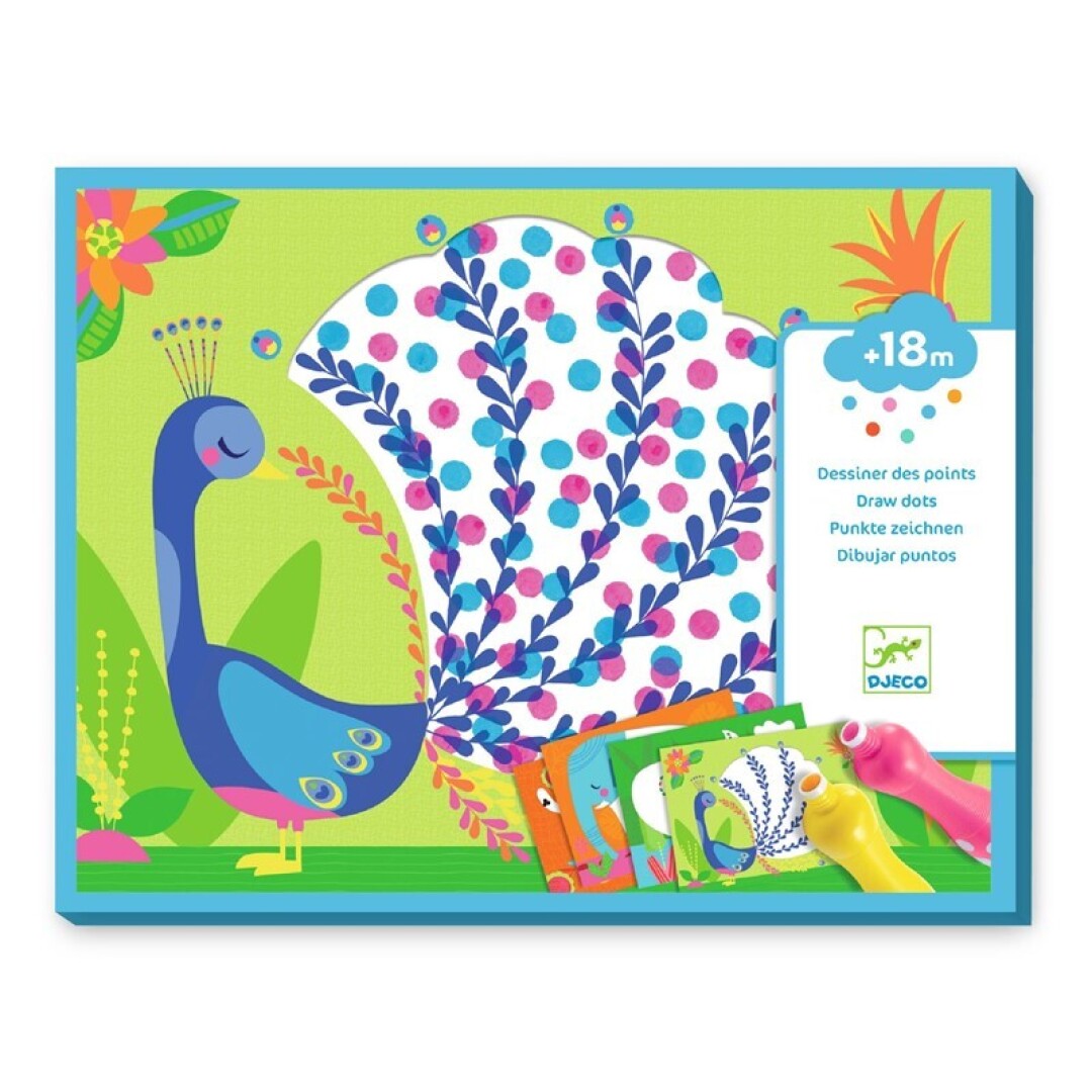 Un primer set de pintura para niños a partir de 18 meses. Con tubos de pintura de espuma. Rellenamos punto por punto las siluetas de los animales. Los puntos se pueden pintar uno al lado del otro o uno encima del otro, cuando hallamos terminado, cerramos la tarjeta y... ya tenemos nuestra hermosa obra de arte.