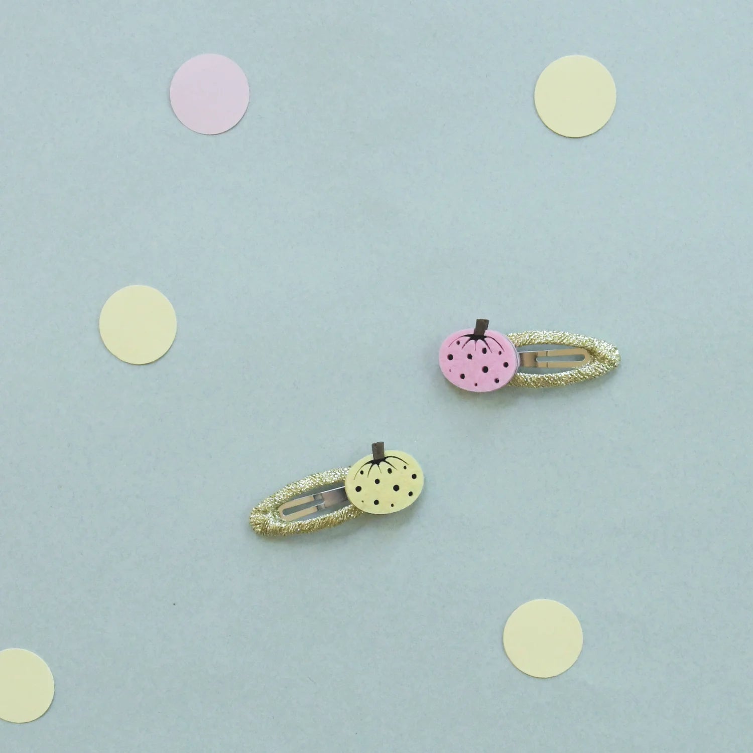 ¡Nuestras pequeñas pinzas para el pelo de calabaza con manchas son una forma súper divertida de agregar un poco de espíritu de Halloween a cualquier atuendo! En rosa chicle y amarillo suave, cada calabaza está decorada con puntos dulces y está asegurada a pinzas envueltas en cinta dorada.